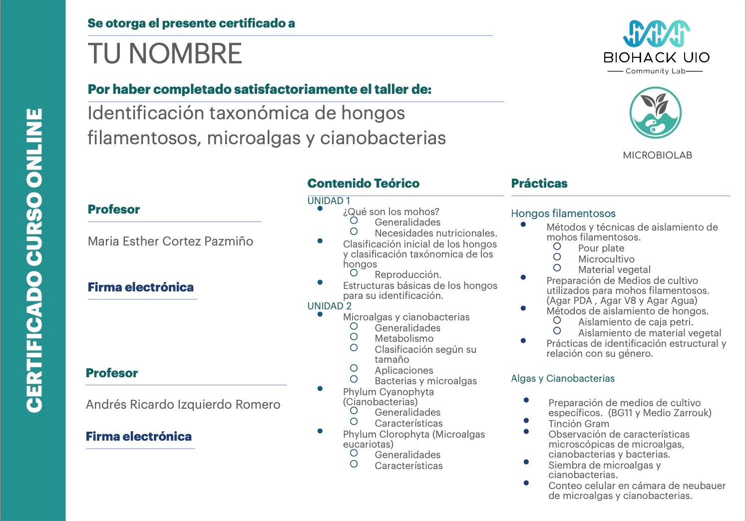 Conoce al equipo técnico que hará que tu experiencia en este curso sea excepcional. Nuestro equipo está compuesto por expertos en taxonomía de hongos filamentosos, microalgas y cianobacterias, con una pasión contagiosa por el mundo microscópico. Están listos para guiarte en cada paso del camino, desde la identificación de especies hasta la comprensión de sus funciones ecológicas. Con su experiencia y dedicación, te inspirarán a explorar y descubrir los secretos de estos fascinantes organismos. ¡Únete a nosotros y déjate sorprender por el conocimiento y la pasión de nuestro equipo técnico!