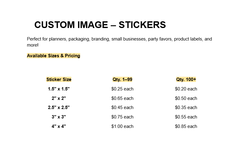 Make a bold statement with our Custom-Made Stickers, thoughtfully designed to capture your unique style or brand! Choose from sizes 1.5x1.5, 2x2, 2.5x2.5, 3x3, 4x4, and an array of other dimensions to perfectly match your needs.