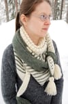 Feather Fall is a triangle shawl with a difference. This arrow-shaped shawl is worked from tip to wide end in two colors of fingering-weight yarn.An easy-to-memorize lace pattern in one color and intarsia stripes in two colors play off of each other on two sides of the central spine. The arrow shape is completed with a garter-stitch triangle made in the accent color. A tassel is added to each corner of the shawl.