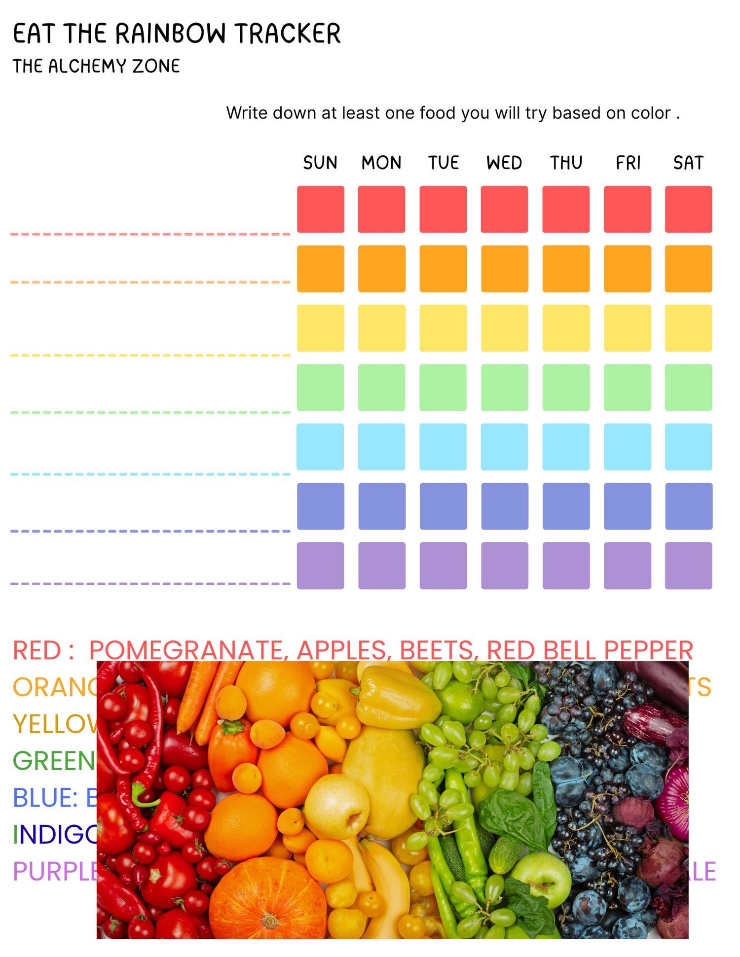 A tracker to help you eat a variety of fruits and vegetables throughout your week. Invites you to write down and track one or more foods you can try for a week based on color .