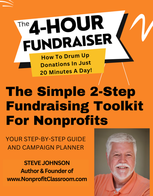"The 4-Hour Fundraiser" helps small and mid-size nonprofits learn how to raise more money with less stress, in less time, without having to worry about starting from scratch, so they can raise all the money they need themselves in short order to fulfill their mission. Convenient digital e-book that puts proven results within reach for even the novice nonprofit worker. Author Steve Johnson leads you step-by-step through a simple process to get organized, get started, and get done with a fundraising campaign.