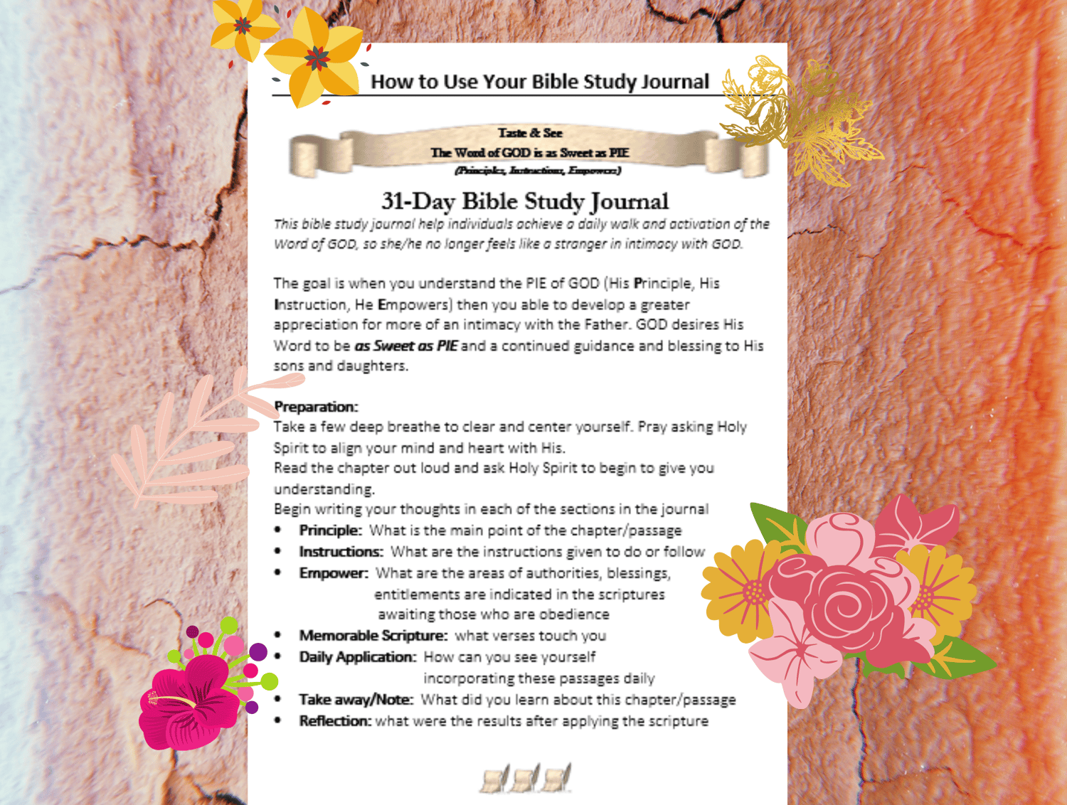 The Taste & See The Word of GOD is as Sweet as PIE 31-day Bible Study Journal is designed for the reader to gain a deeper intimacy with the Father and the ability to activate the promises/blessings of the Father’s written & spoken word. Many of us read and study the bible to gain knowledge of GOD, but do we know the heart of the Father for ourselves.
