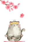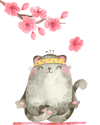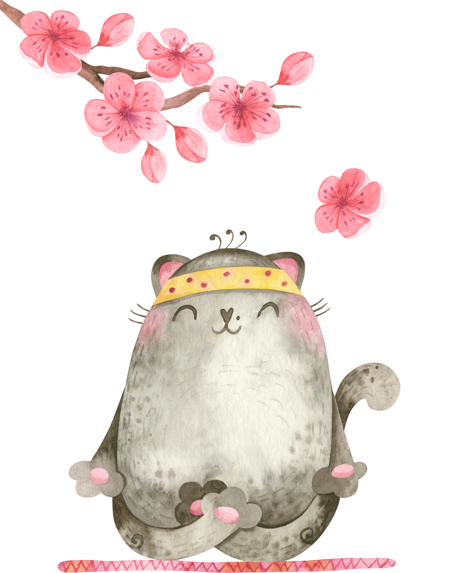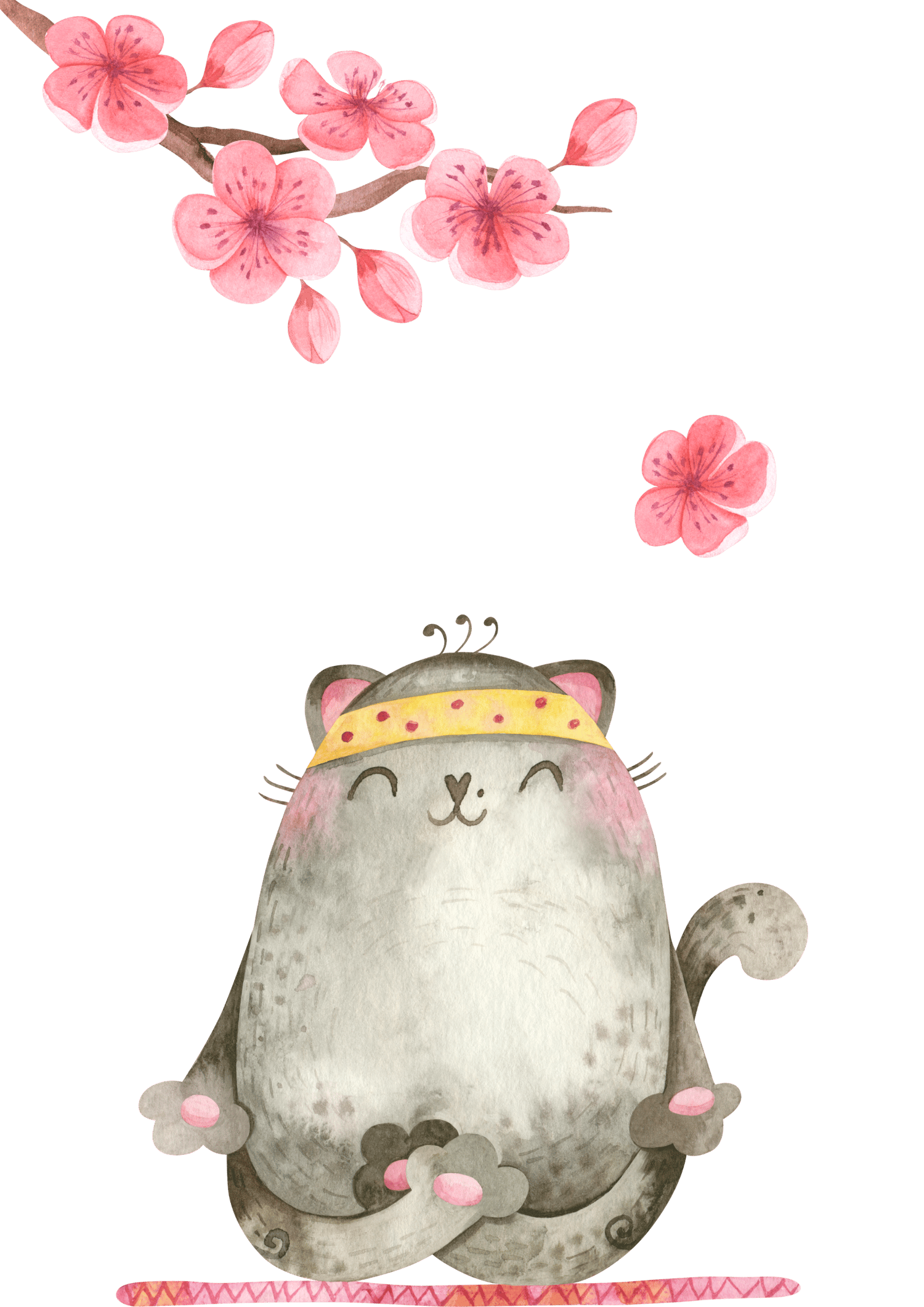 Cute cartoon cat meditating under a pink cherry blossom branch.
