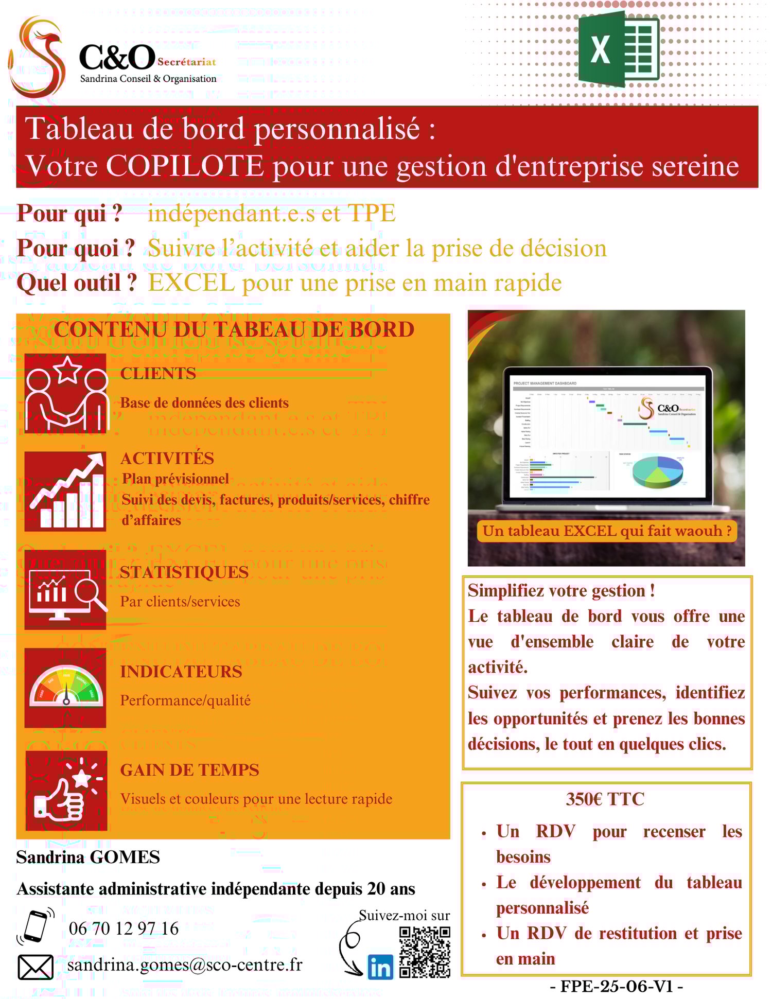 Je construis **votre tableau de bord personnalisé**, en m’appuyant sur vos documents existants, votre organisation, et vos besoins concrets. Vous repartez avec un outil clair, prêt à l’emploi, et adapté à votre activité.
