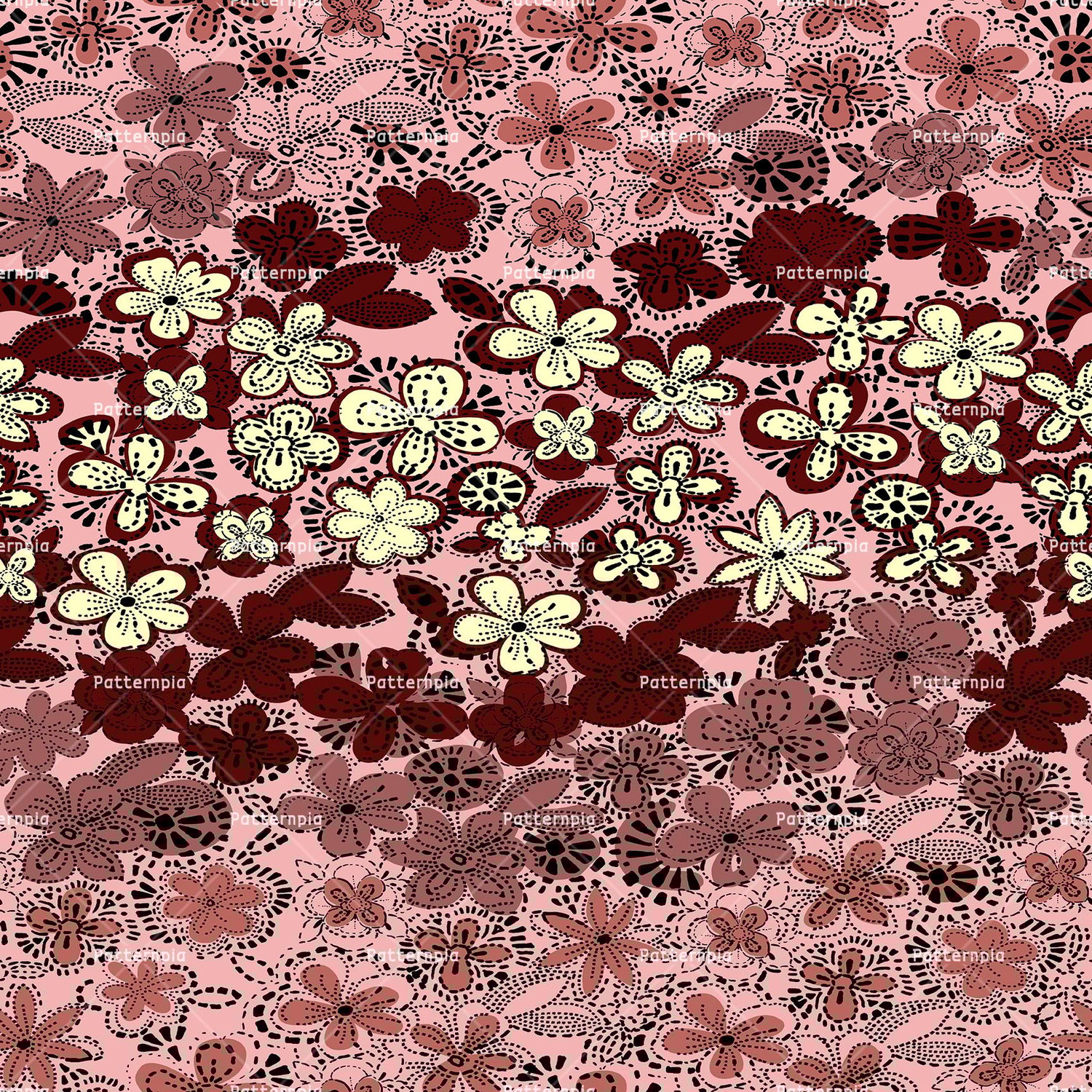Layered crimson and cream florals on a pink ground.