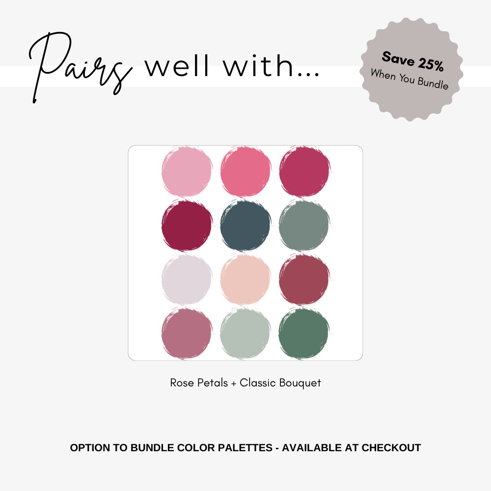 Enrich your brand's visual identity with our Rose Petals Color Palette, inspired by the rich and romantic hues of nature. This palette features a stunning array of shades including deep, dusty pink, dark pink, rouge, and maroon, complemented by dark green blue and sage green. Perfect for both spring and summer themes, these colors will bring a touch of elegance and sophistication to your small business branding.