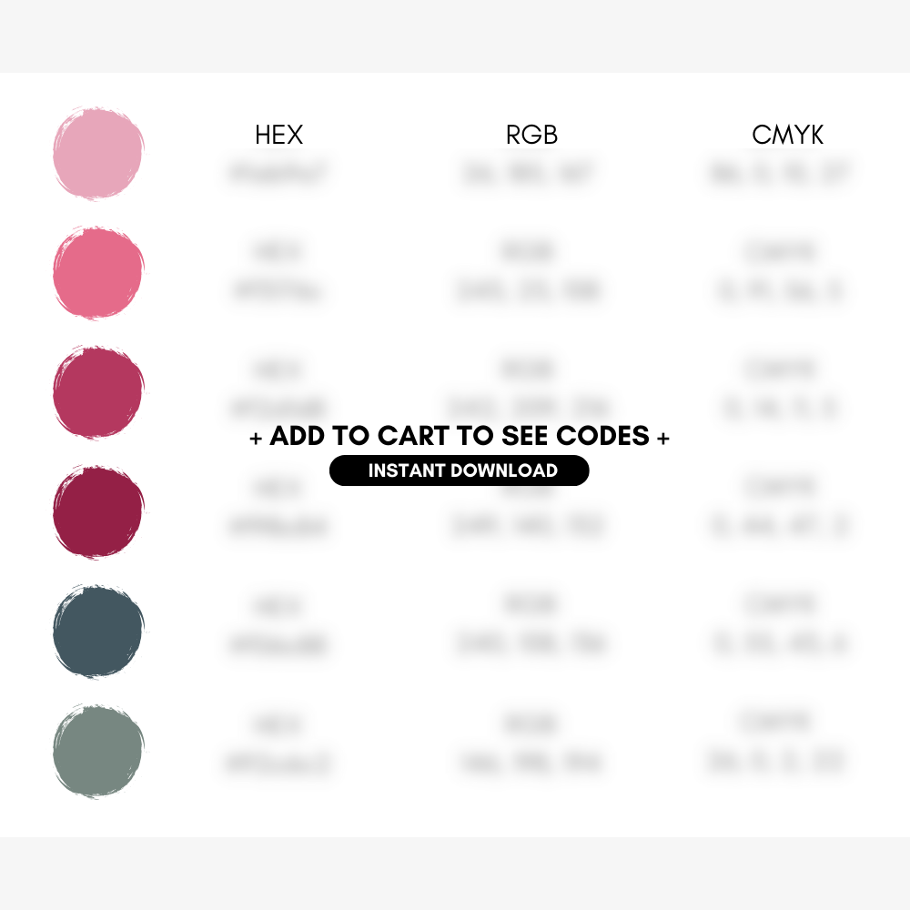 Ideal for use in packaging, marketing materials, social media posts, logos, banners, and website design, our Rose Petals color scheme is your go-to solution for cohesive and captivating brand colors. Each purchase includes exact Hex Codes, RGB, and CMYK values for seamless integration across platforms like Canva and Procreate. Elevate your personal branding with this thoughtfully designed palette, perfect for aligning your visual identity with your business's unique story. Whether you're refreshing your brand or starting anew, let these colors breathe life into your projects and leave a lasting impression on your audience.