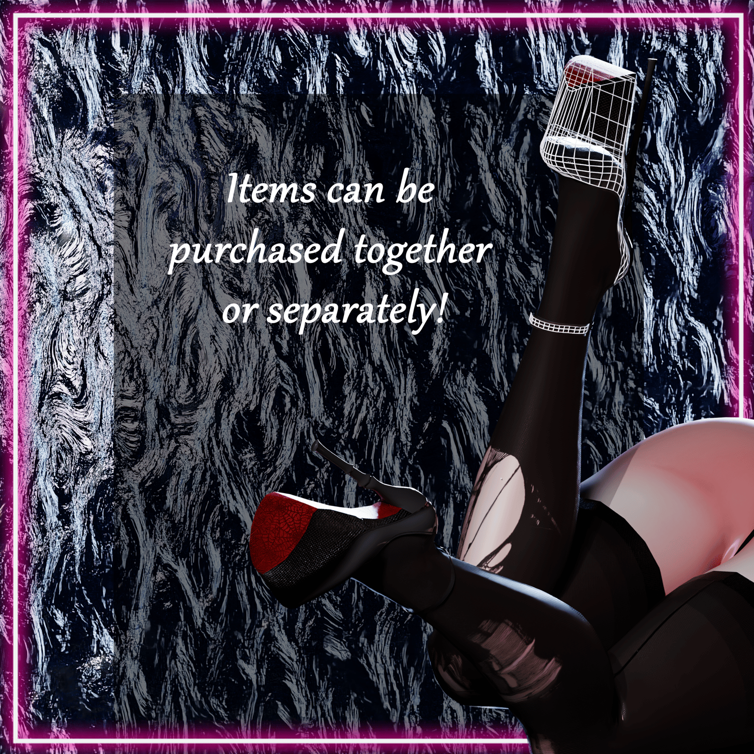 - Full outfit: Bra, corset, skirt, panties, stockings, heels, wasit chain.
