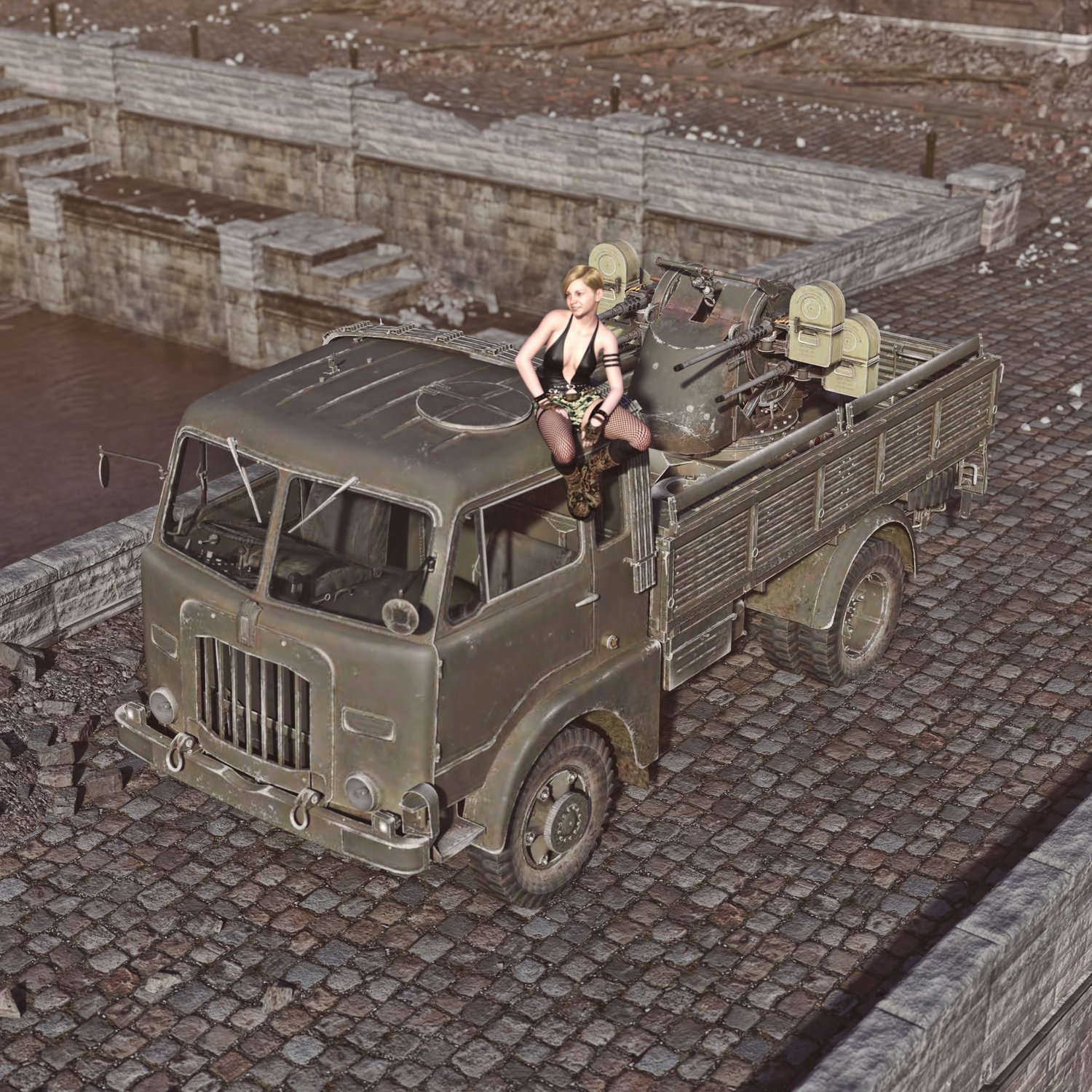 An Italian truck with mounted quadruple heavy machine guns for protection against aerial targets. Cool looking and a bit intimidating :) Can serve as a general truck (gun can be hidden) or as is. Rear can be opened if needed. Provide good mobility. The turret is rigged and can rotate and pivot for realistic pictures.