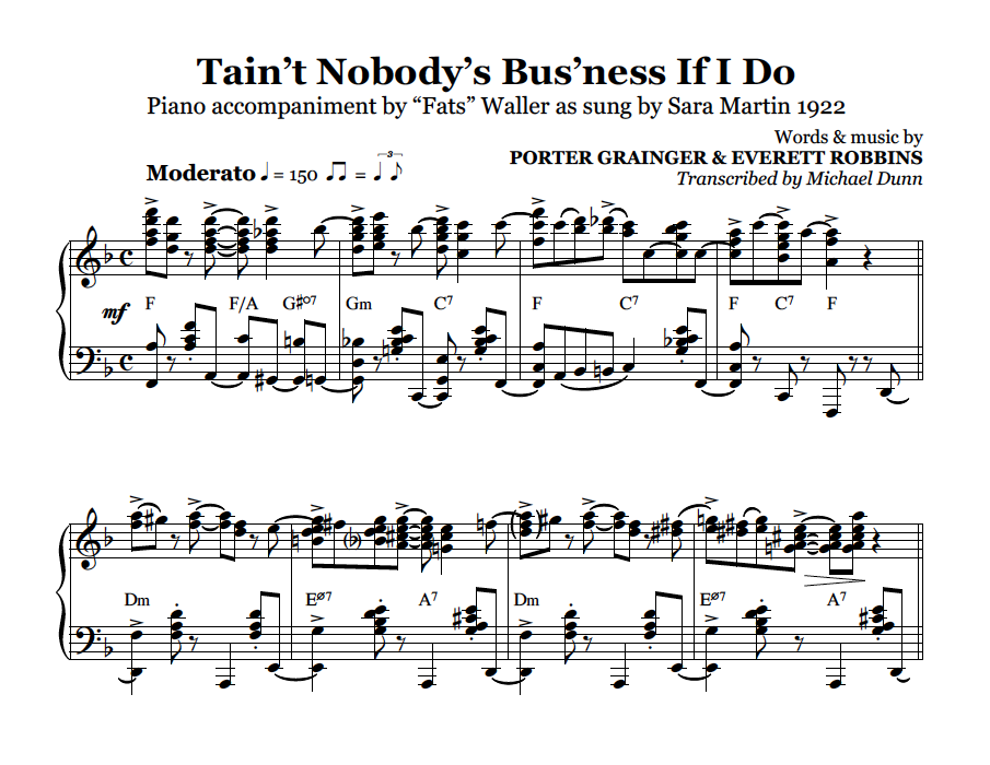Although records state his piano solos Muscle Shoal Blues and Birmingham Blues were recorded the previous month, Fats always maintained that this Sara Martin recording was his very first recording. This is a transcription of the entire performance so we can hear the young Fats, only 18 at the time, in all his youthful, exuberant brilliance.