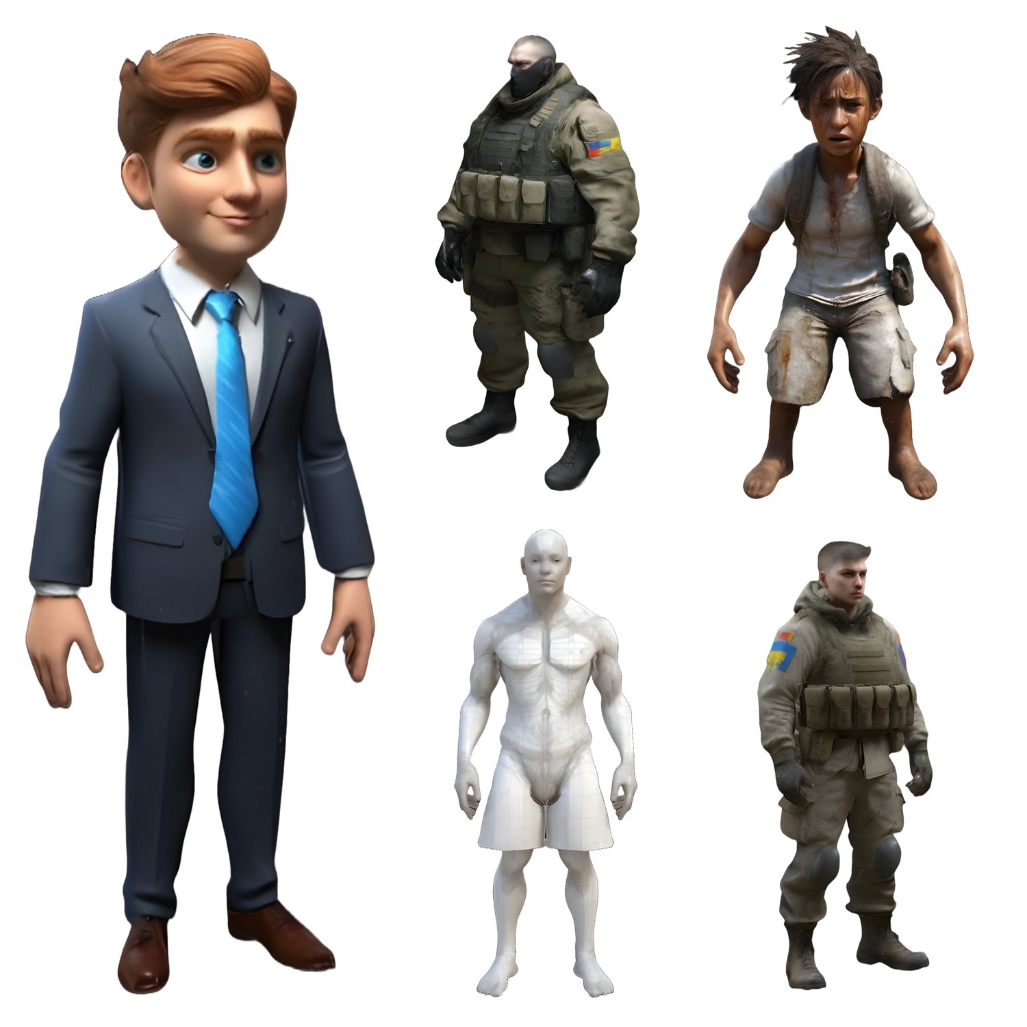 This unique character pack features five highly detailed 3D character models, designed for various creative applications. From a professional cartoon-style businessman to a battle-ready soldier and a survival-themed child, this collection offers versatility for animators, game developers, and 3D printing enthusiasts. Additionally, it includes a realistic anatomical model for study and artistic purposes.