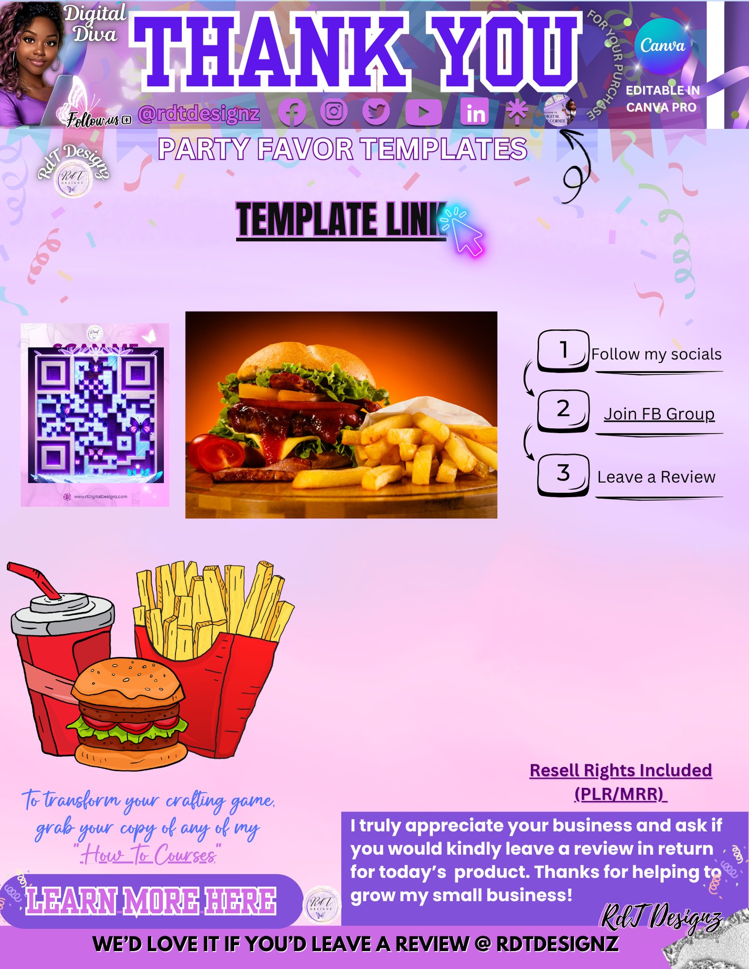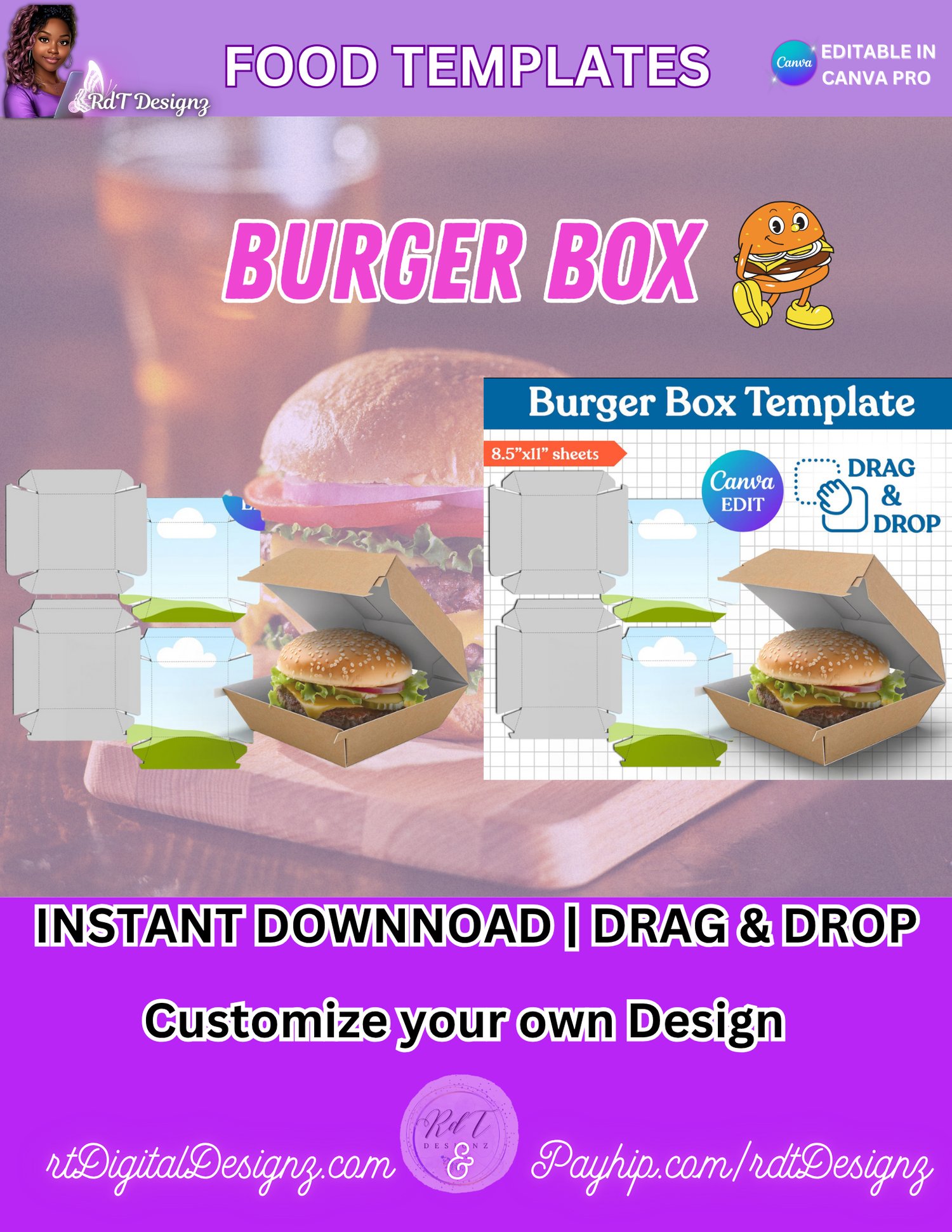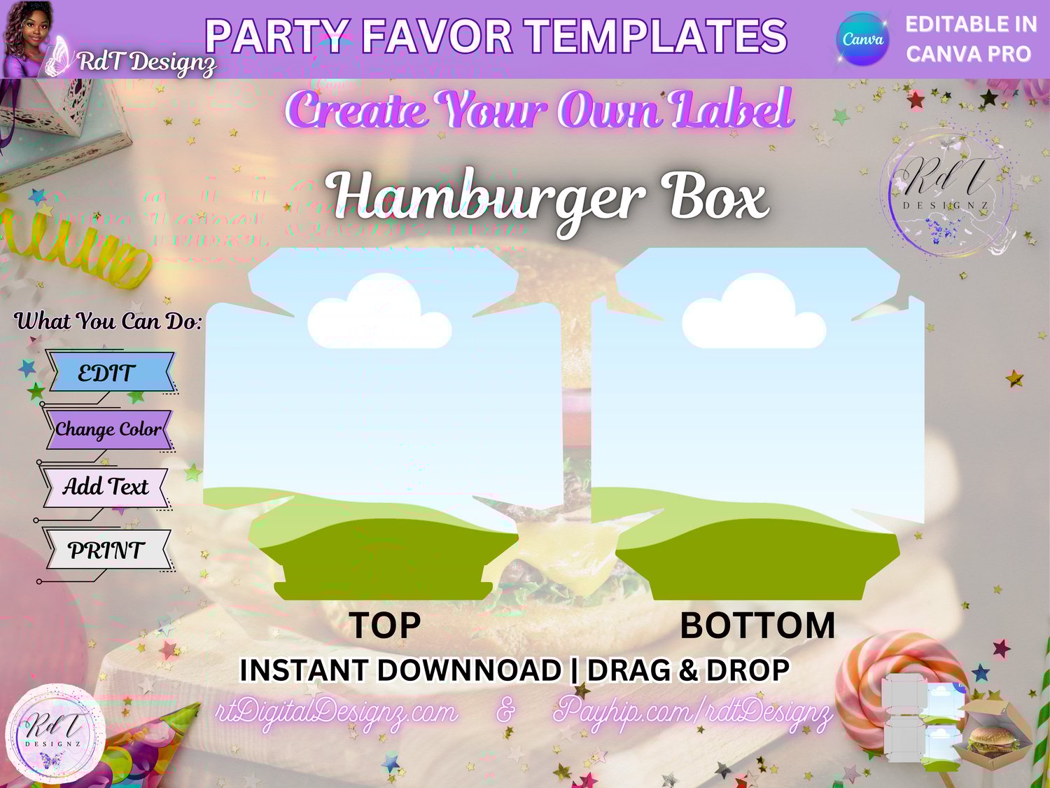 With our user-friendly designs, you can easily personalize your burger box with your favorite toppings and creative ideas. Simply purchase the label from RDT Designz, and you're ready to impress your guests with a fun and delicious presentation!