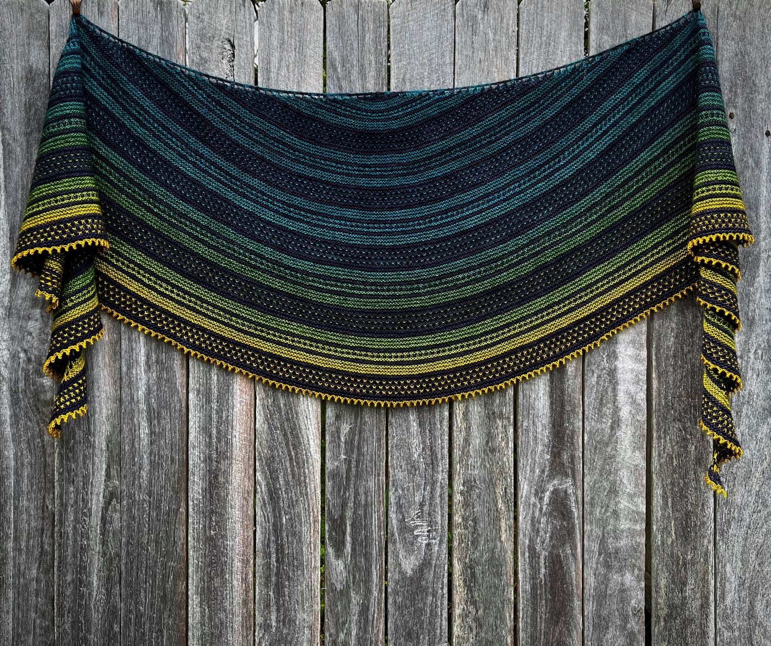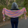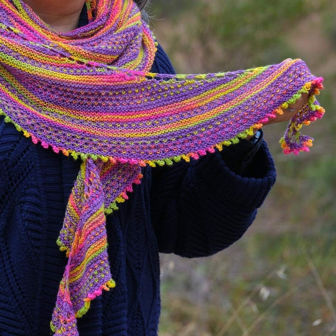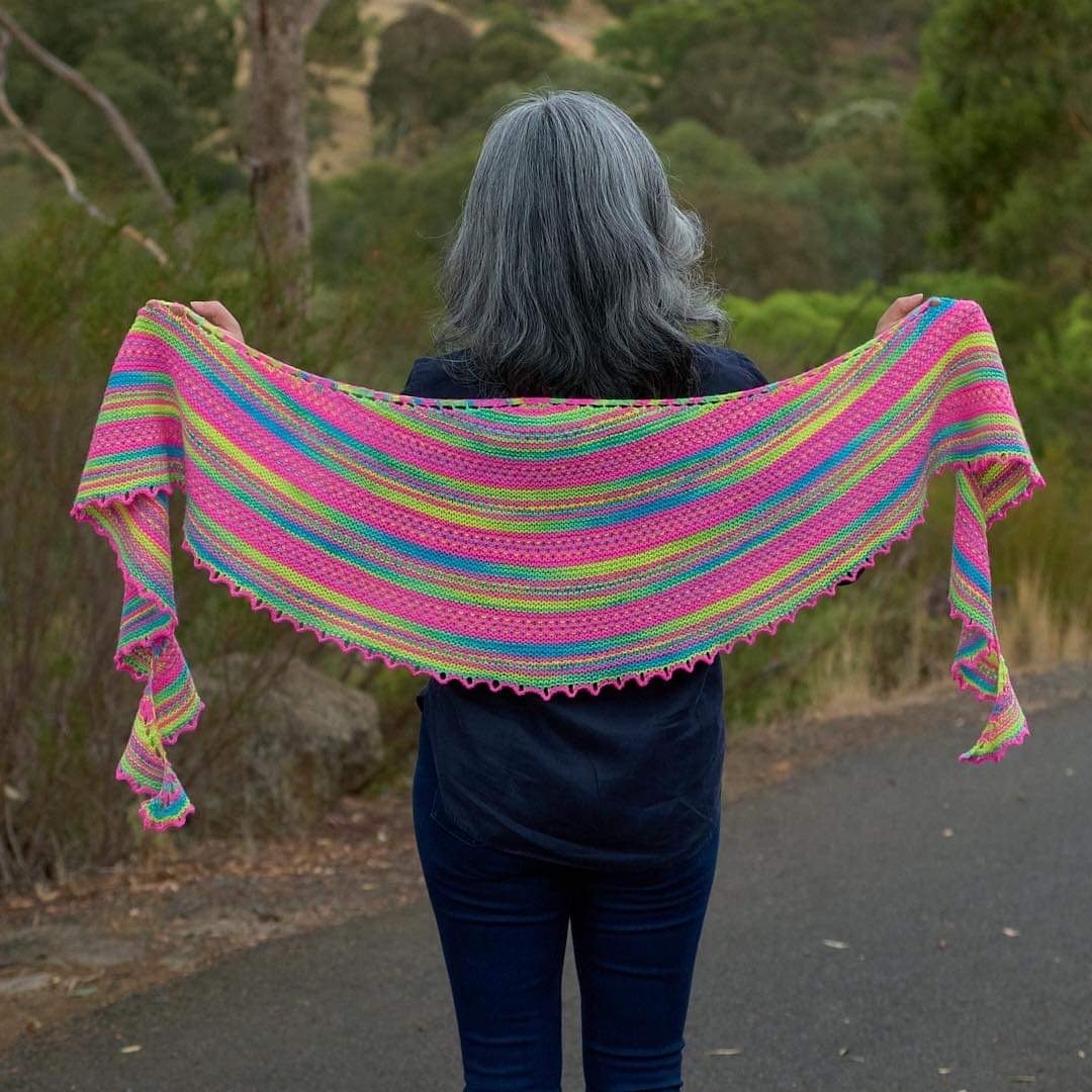 The size M (variegated) samples were knit using the TROPICAL PARADISE - Purple and TROPICAL PARADISE - Pink kits by Cat & Sparrow Australia. If you would like to knit your Burstling shawl using one of these super-fun colour combos, you can purchase a kit that also includes a download code for the pattern from Cat & Sparrow Australia here.