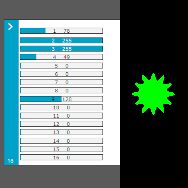 * En el modo "16CH Standard" verifique, con un Fixture de pruebas (click), que coincidan estos canales: 3 Dimmer, 2 Strobo / Shutter, 1 en el valor 78 = Color Verde, 4 en el valor 49 = Gobo de Sol, 9 foco (ver tercer foto).