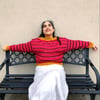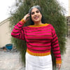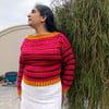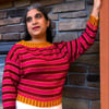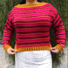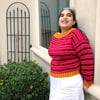 Ha’il is inspired by the fortified city which is the last stop to the north before the open desert, it is styled in a similar fashion to the traditional textiles of the area, with a color work pattern that imitates the shape of the mud bricks of the fortress itself. This pullover is knit from the bottom up with a modified Dolman sleeve and is knit with positive ease. Both the bottom edging and the cuffs on the sleeves are knit in a highly contrasting corrugated ribbing, then continues in a geometric diamond chain design before the striping begins.