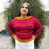 Sample size knit at 54 inches / 135 cm and shown on a 41 inch / 104 cm high bust.