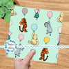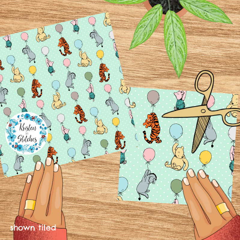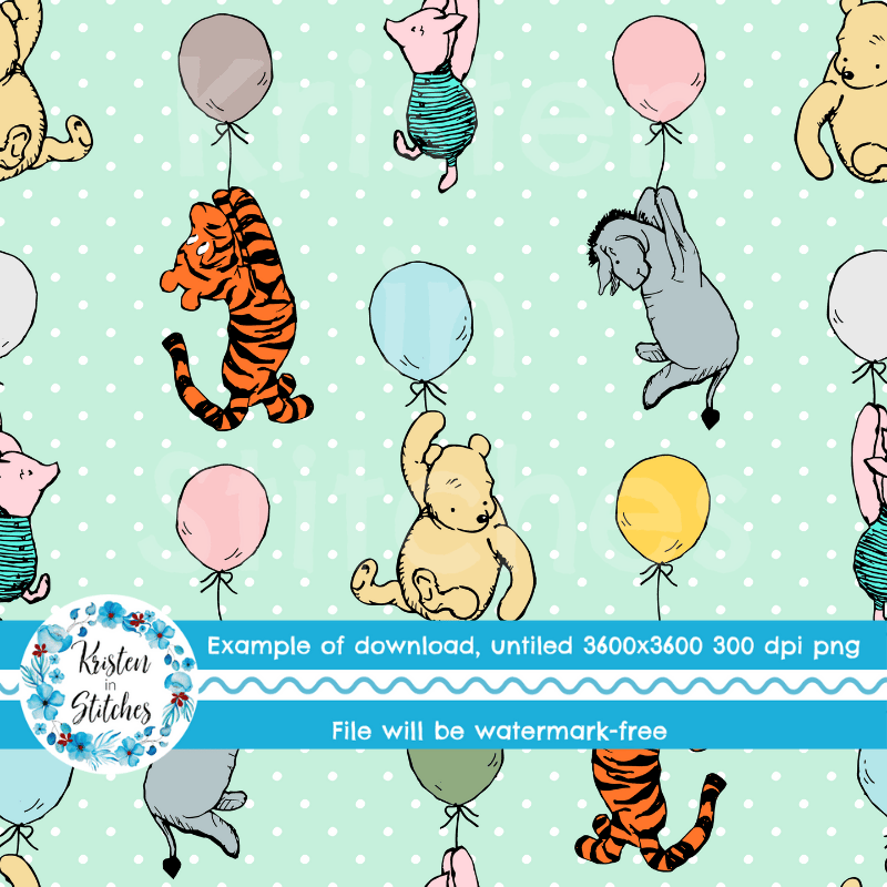 Classic Pooh storybook characters with floating balloons, including Eeyore, Tigger and Piglet.
