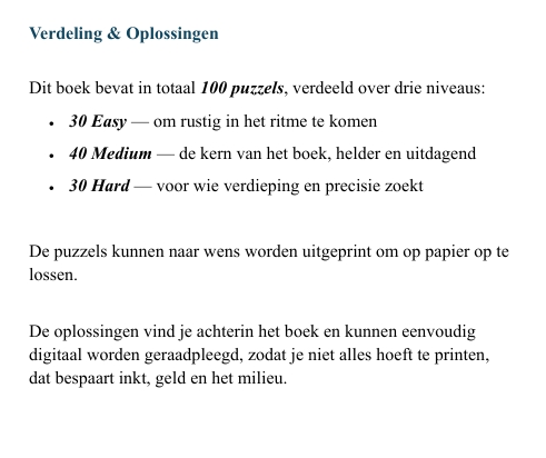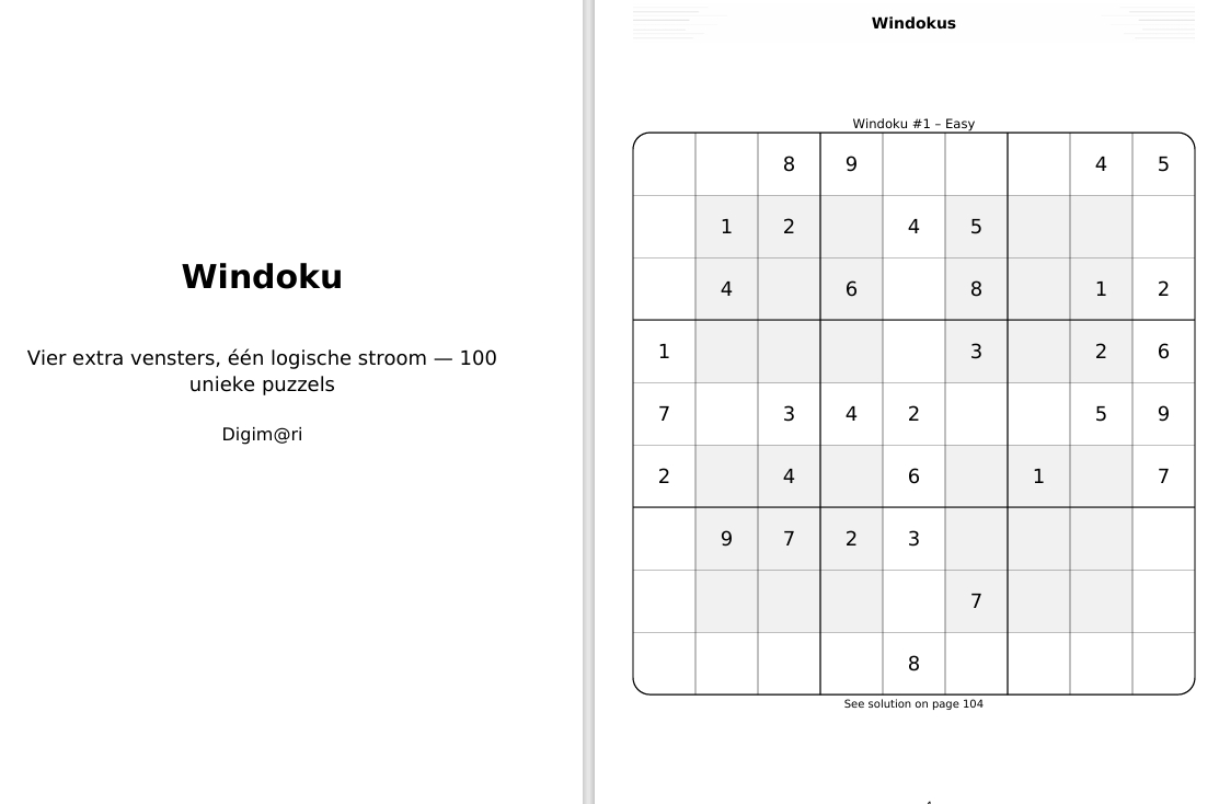 Deze editie bevat 100 A4‑printbare Windoku‑puzzels in Easy, Medium en Hard.