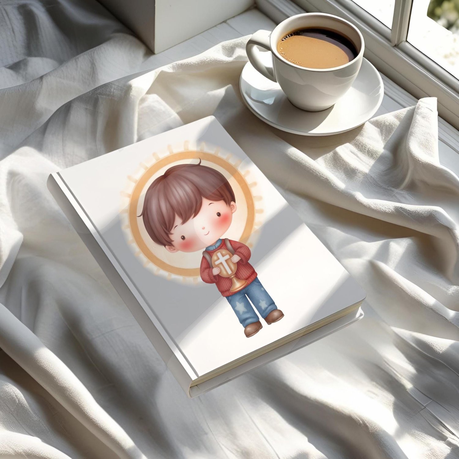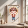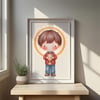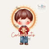 1x Ilustración principal del Beato Carlo Acutis: Una imagen completa del Beato, en un estilo dulce y moderno, ideal para estampitas, oraciones, recordatorios y más.