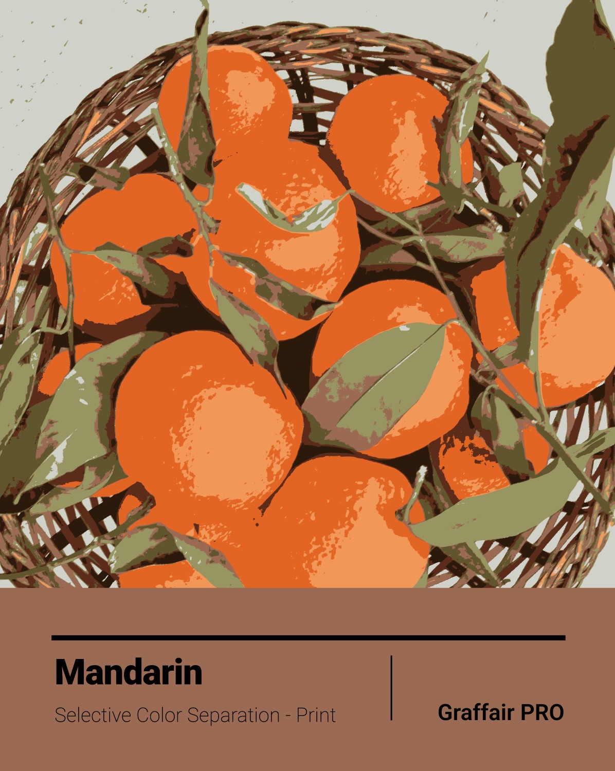 Mandarin: An image of a basket full of mandarin with its leaves. The colors have been selected and separated, visualizing a print effect.