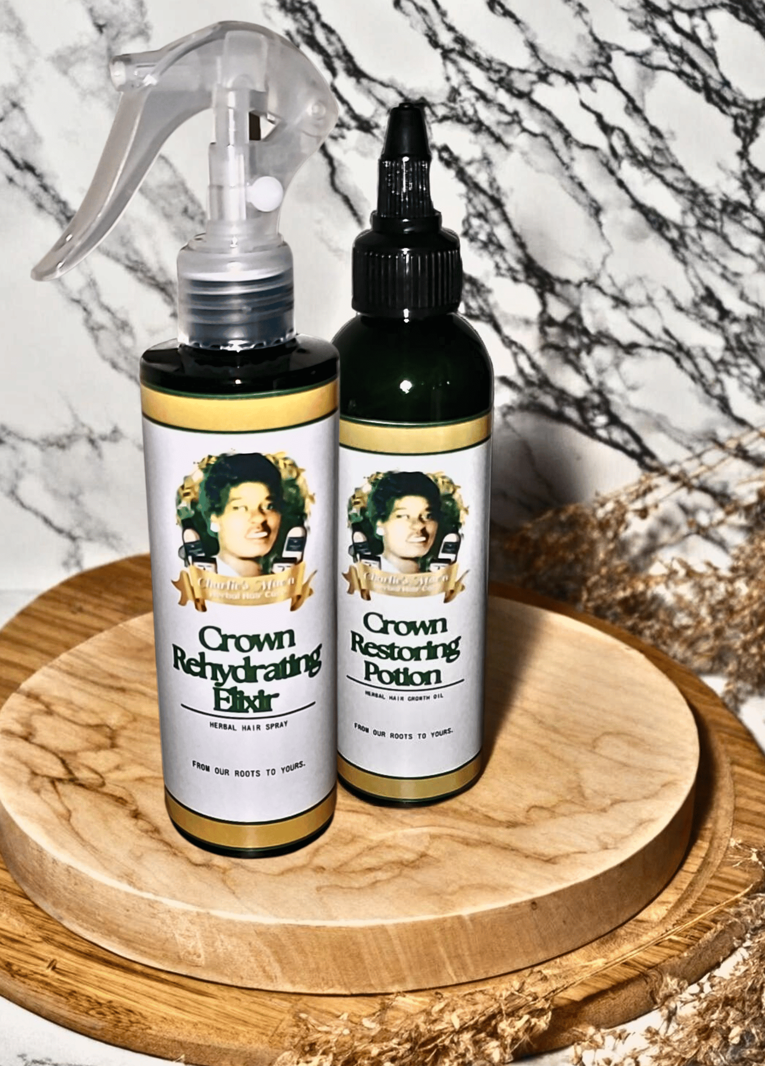Our Crown Rehydrating Elixer is the ultimate hydration for your natural hair. This herbal infused spray relieves itchy scalp, promotes hair growth & prevents shedding, is anti-inflammatory & provides your hair with all the nutrients it needs to be stronger, softer, & healthier....all while moisturizing your hair & scalp. And our continuous spray bottles saves your fingers from excessive squeezing & gives a even coverage!