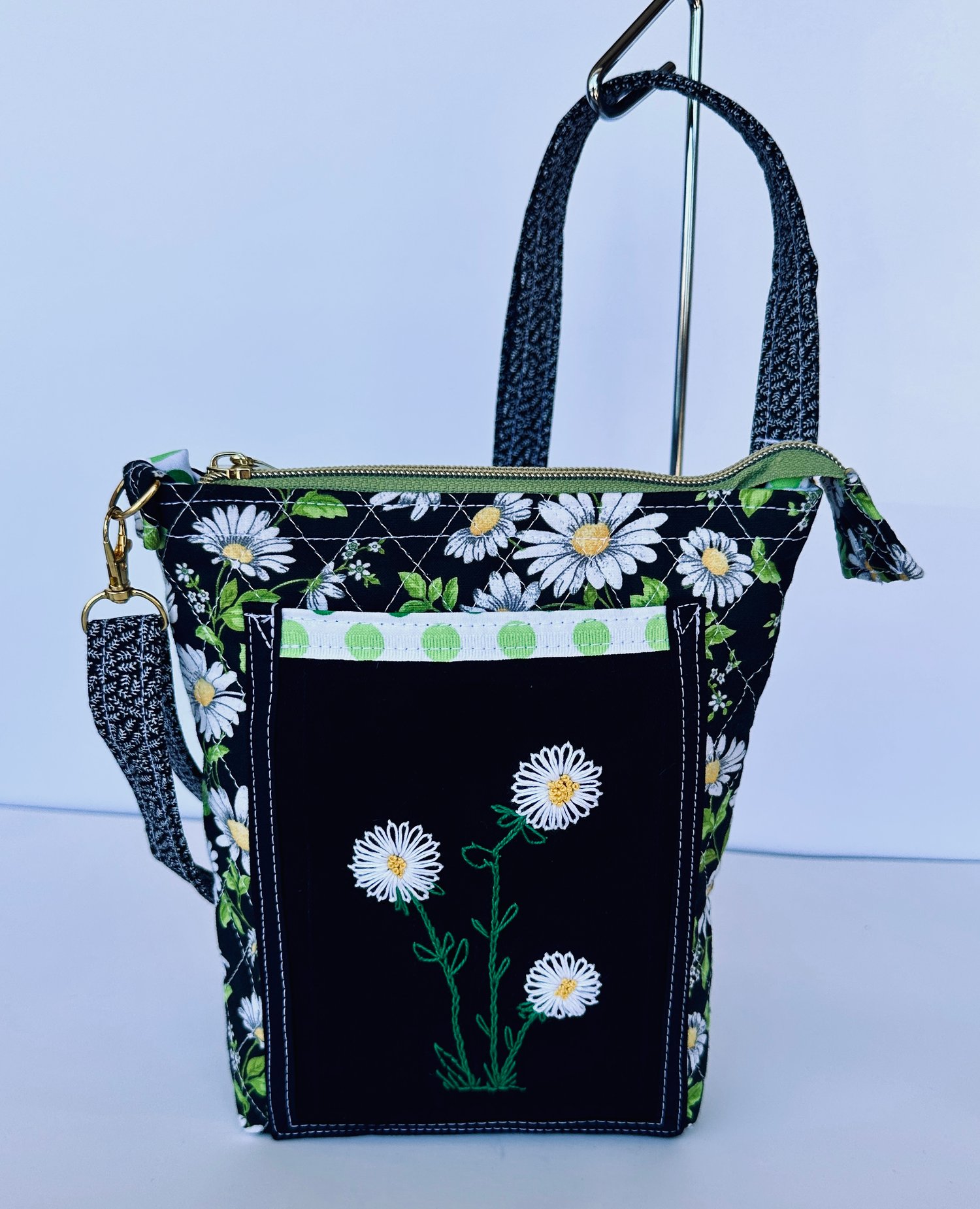 The body of this bag is made with a pre-quilted fabric that is black with daisies on the outside and yellow and white daisies on the interior. I added a slip pocket for those small items.
