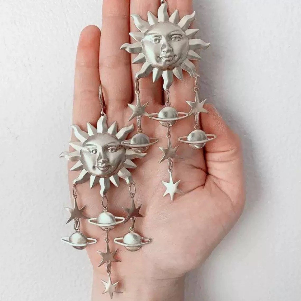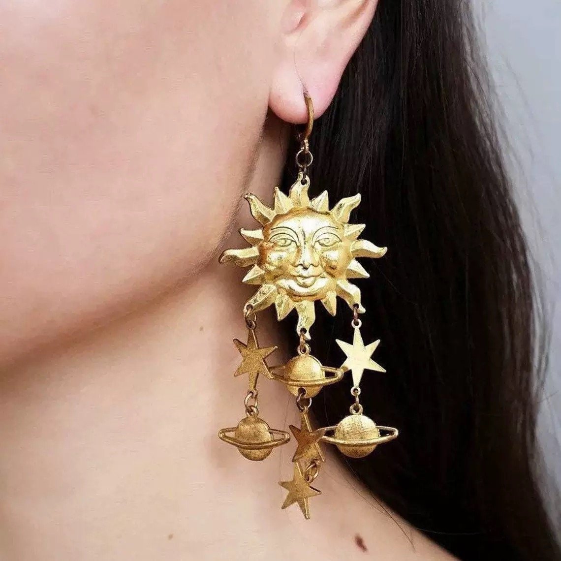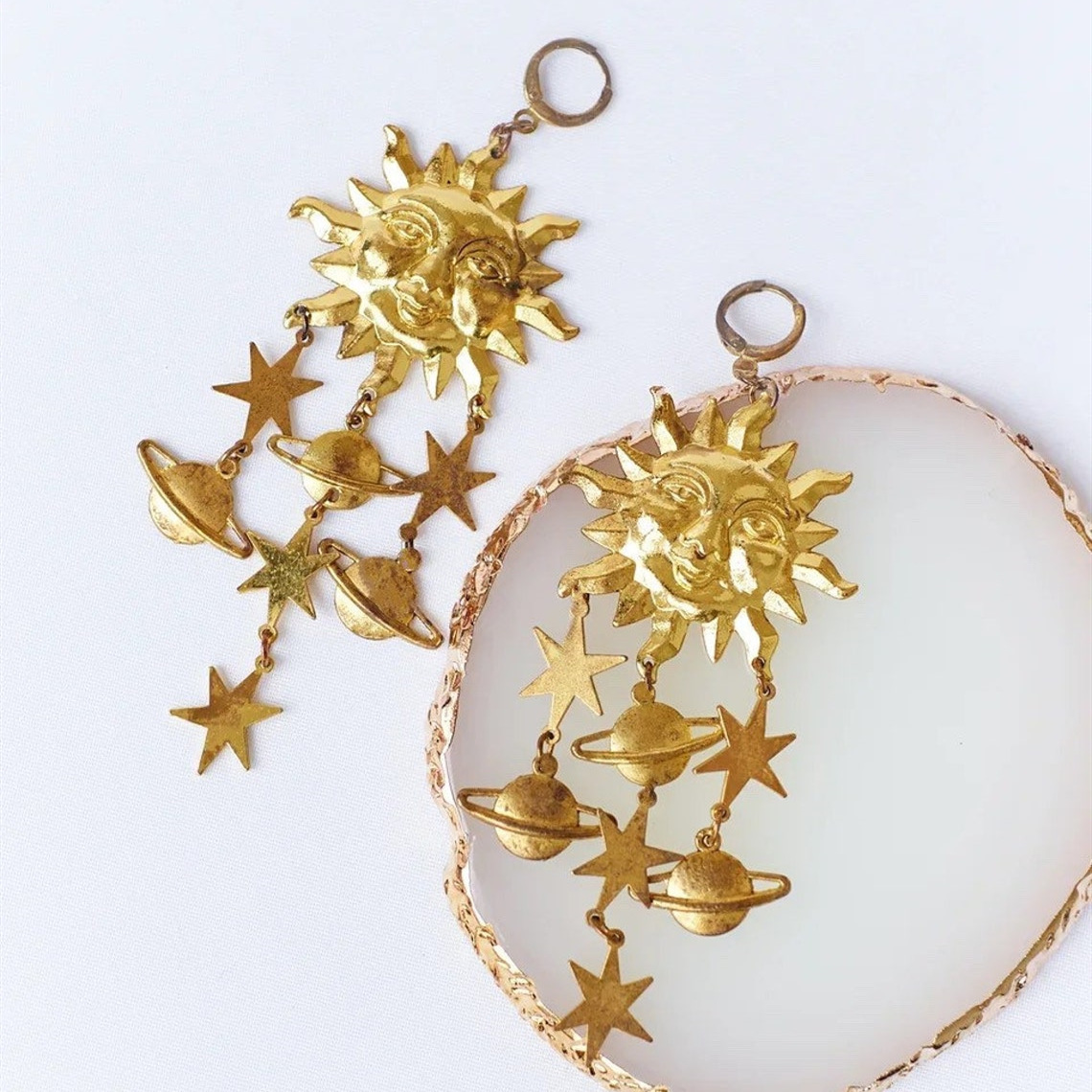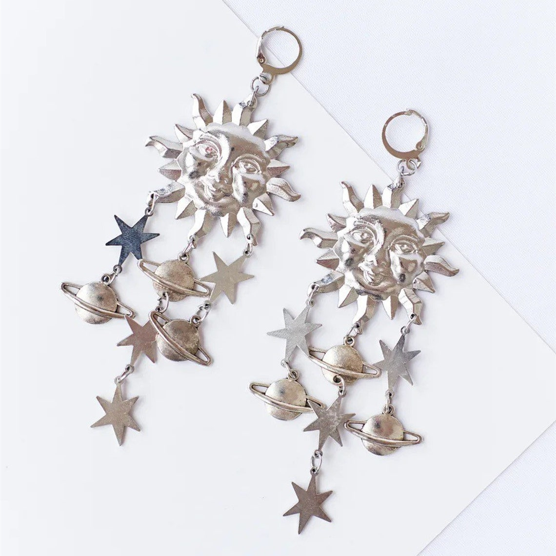 Whimsigoth witchcraft magic sun goddess universe stars golden silver drop earrings