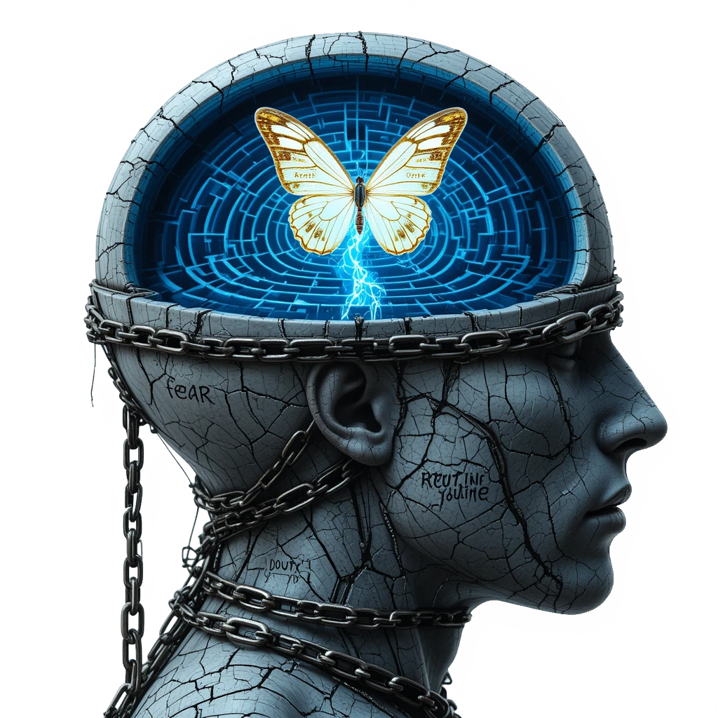 "Mind in Chains" is a cinematic exploration of the human psyche under pressure — a poetic visual that reflects how our thoughts can become prisons built from fear, doubt, and routine. Yet within this confinement, a spark of freedom always exists — a fragile idea, a creative impulse, a dream in flight. This artwork captures that duality: the weight of mental chains and the silent rebellion of imagination breaking through. It’s a tribute to every mind that fights to stay free.