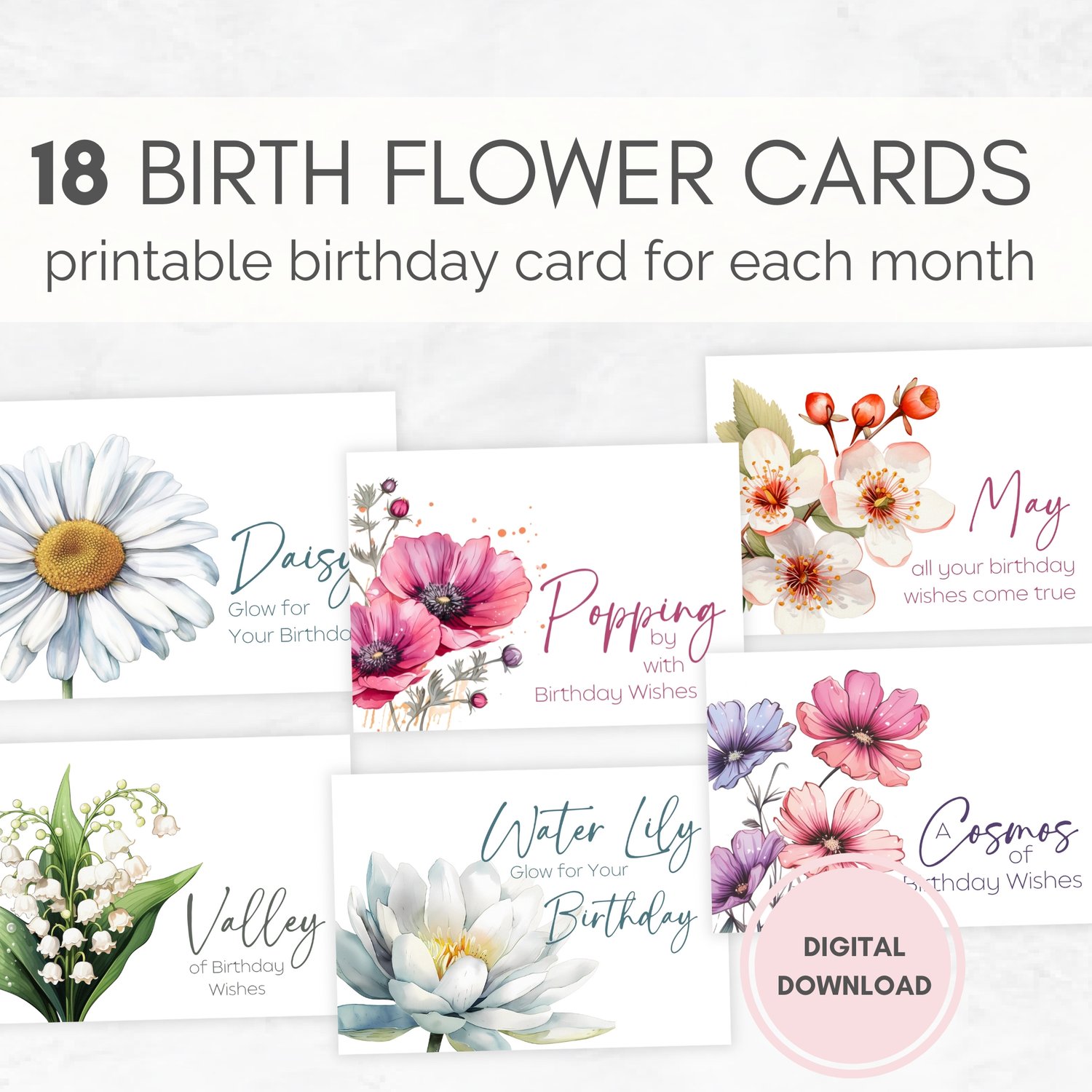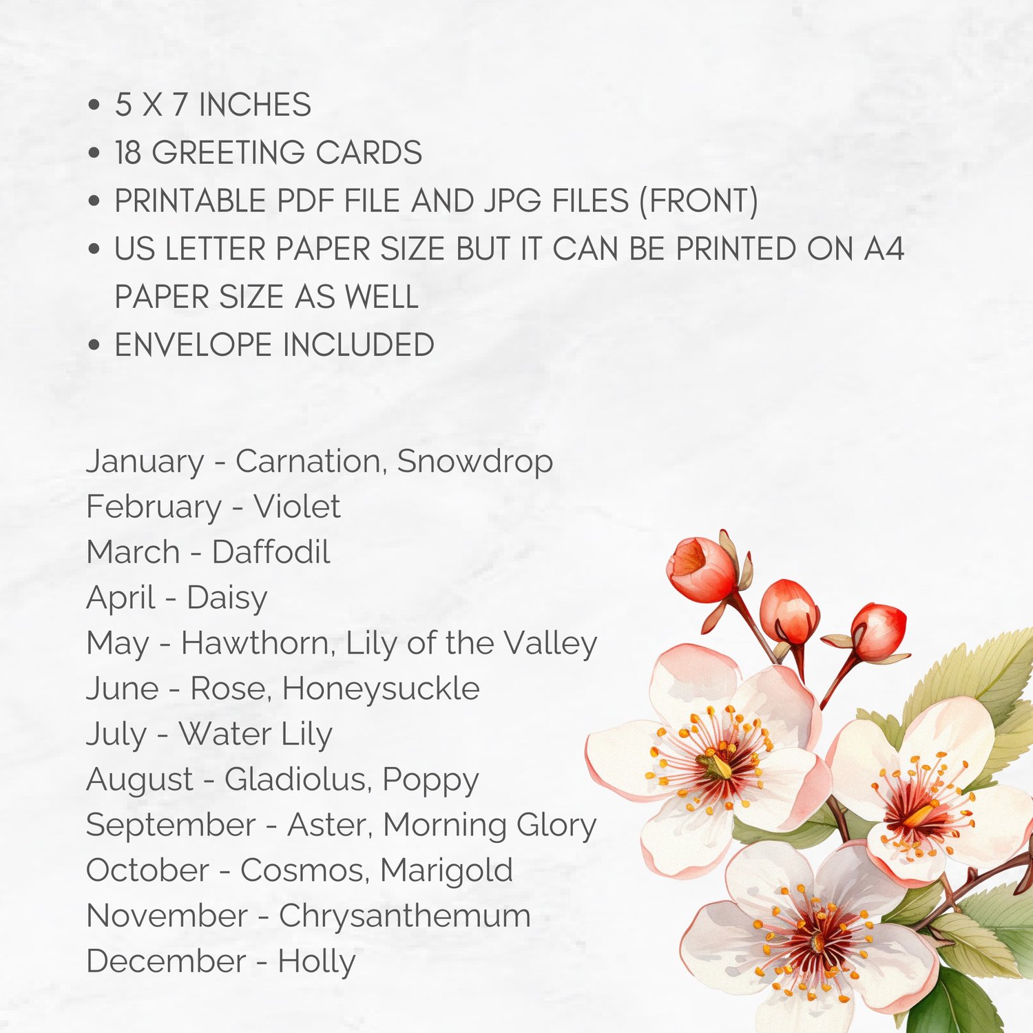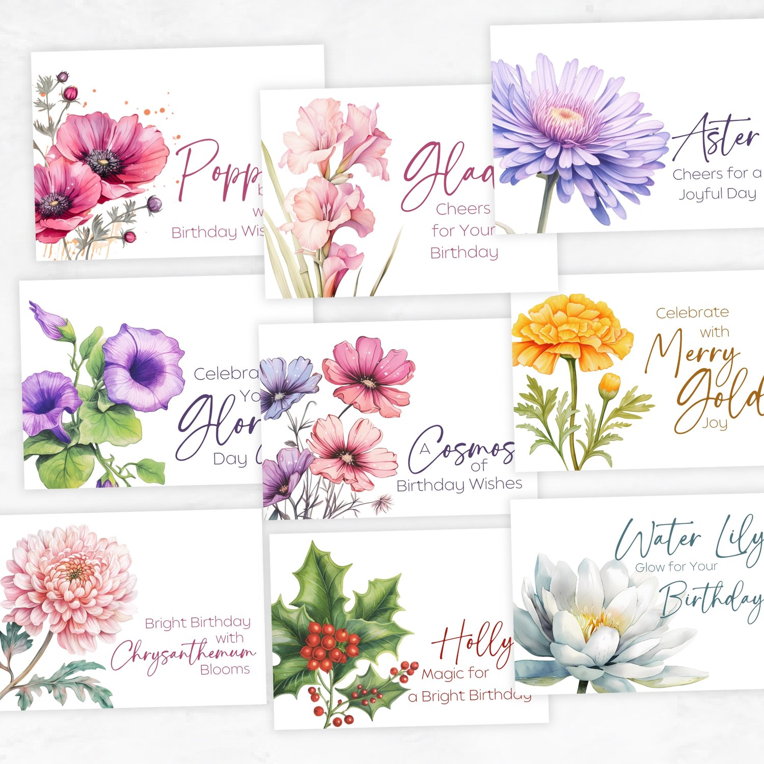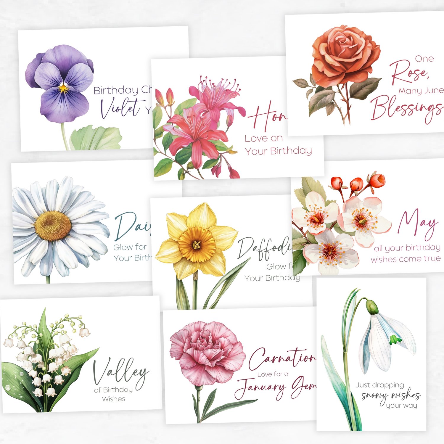 Birth Month Flower Birthday Cards Set - Floral Birthday Card for Each Month