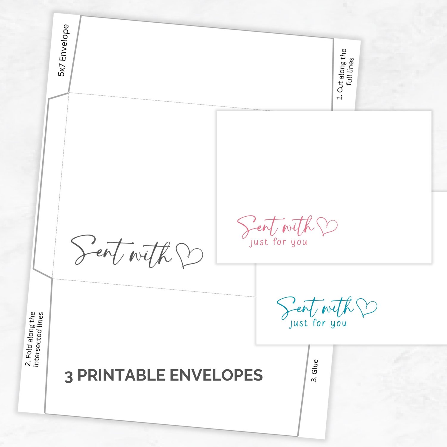 - 2 ready-to-print pdf files with envelopes (grey, pink and blue text, US letter size & A4 size)