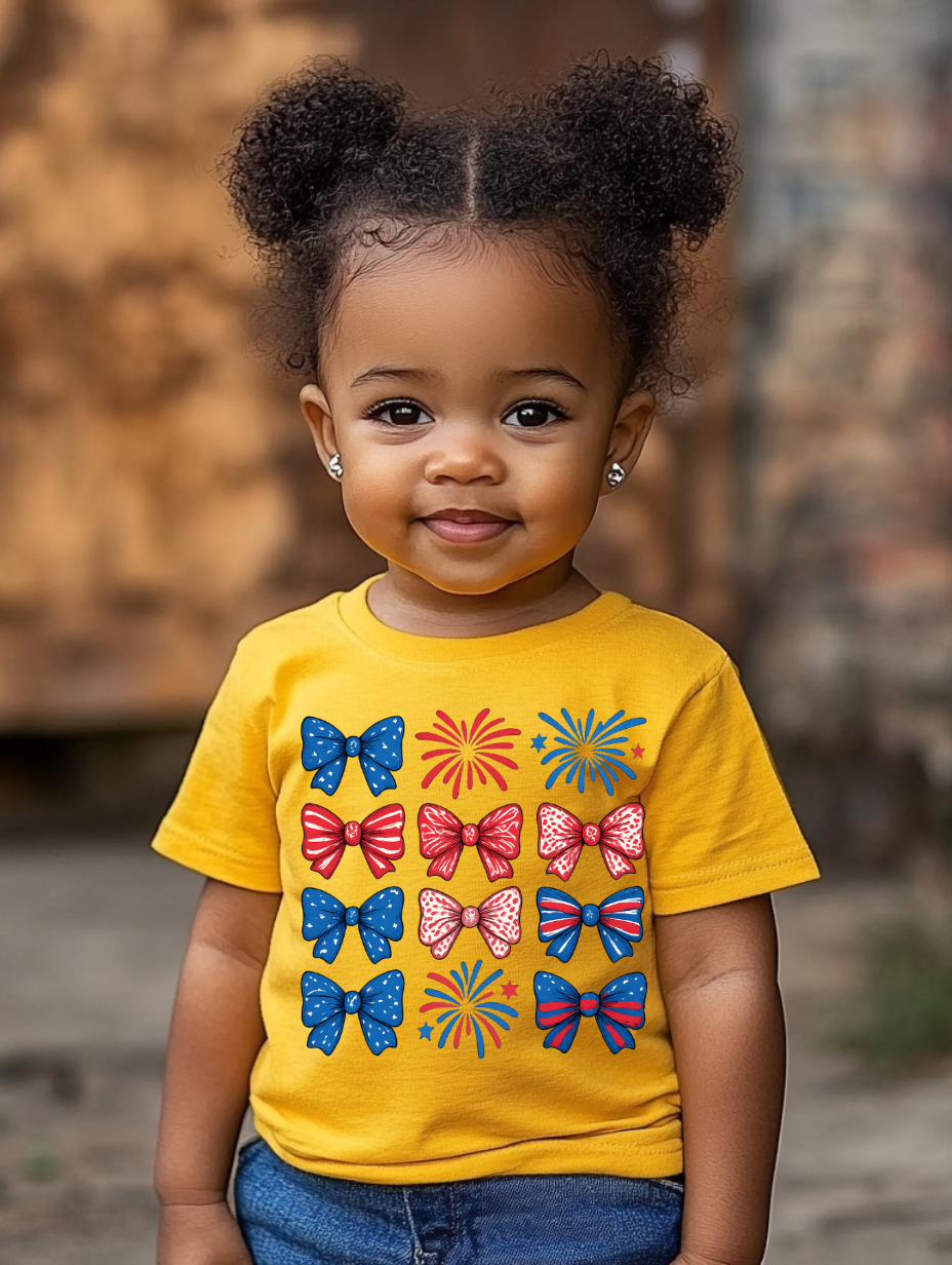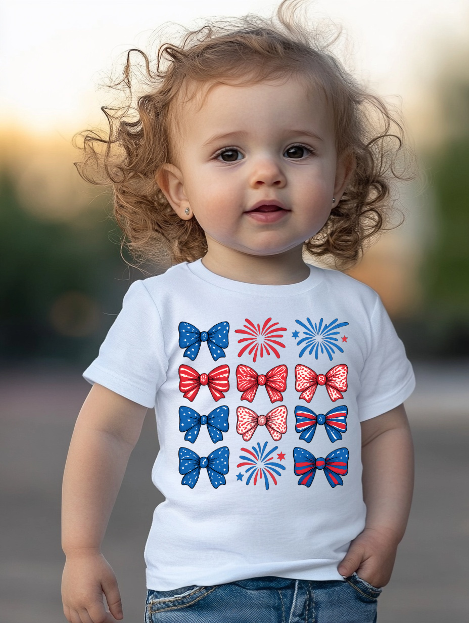 Celebrate the Fourth of July with style and sparkle! This Red, White & Bows design is perfect for creating festive t-shirts, kids’ outfits, tote bags, and more. Designed with bold patriotic colors, this graphic includes red and blue bows and fireworks that pop with personality — perfect for the little firecracker in your life!