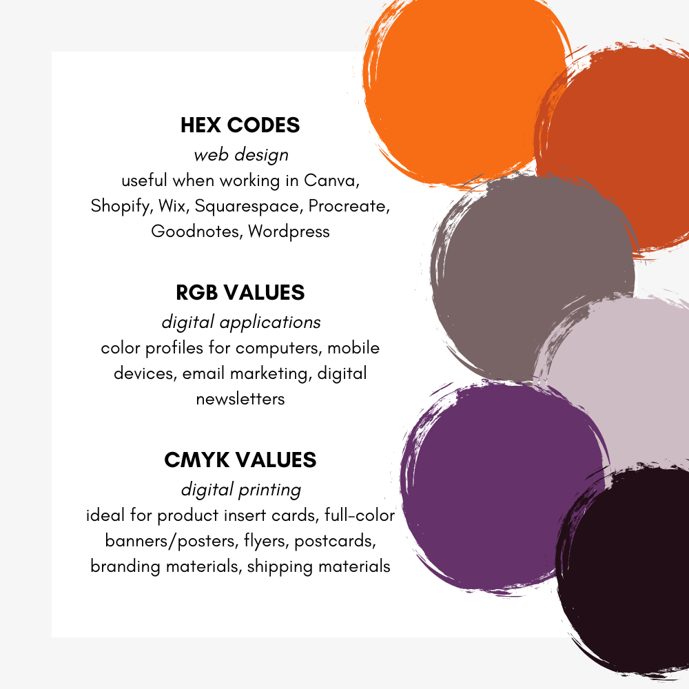 + Detailed Hex Codes, RGB, and CMYK values for each color