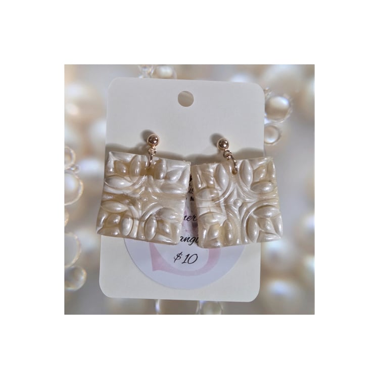 These polymer clay dangle earrings feature a soft oval shape with a muted vintage floral design in pastel tones. Lightweight and finished with rose-gold style posts, they add a gentle pop of color and a handmade feel that’s easy to dress up or down.