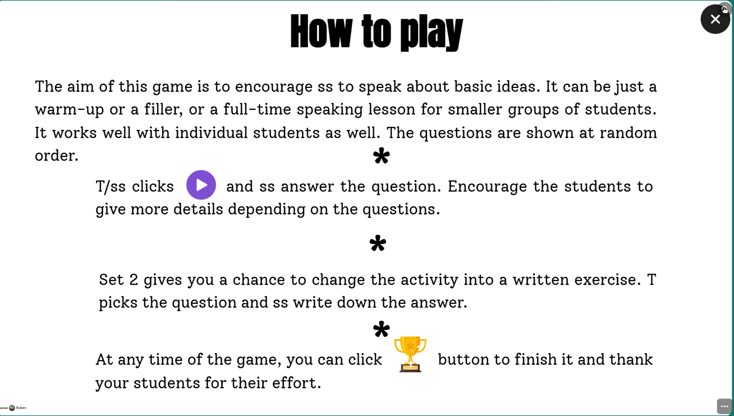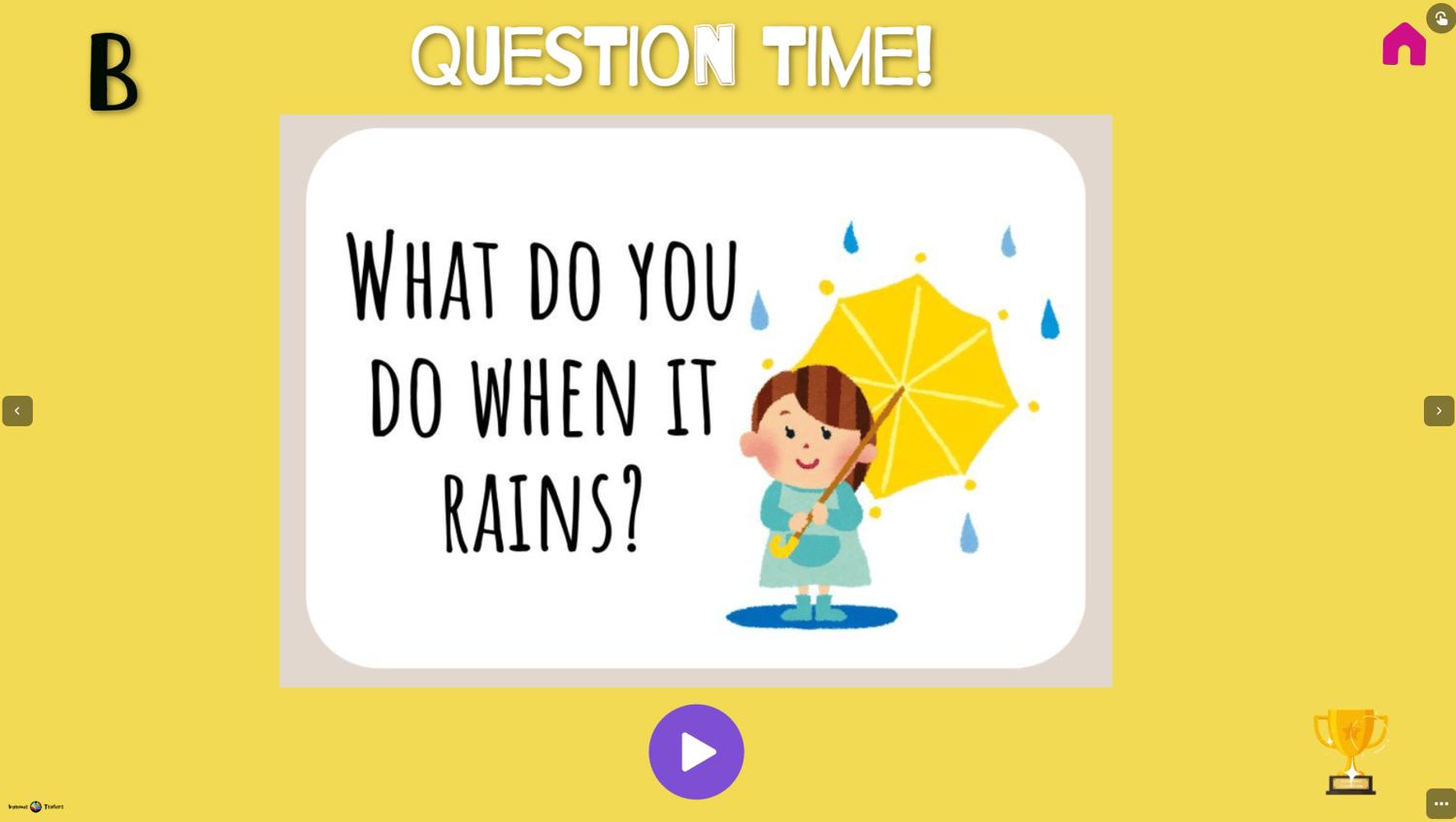 Surprise your students with fun questions to start a lesson. Or play around any time you want. Give your students extra practice with easy questions to make them speak more and more. Have fun with our interactive presentation. No prep, pure fun!