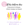 My unity in diversity classroom poster beautifully displays the phrase "All are welcome here" in both English and Japanese, complemented by colorful illustrations of children from diverse backgrounds. Printed on high-quality material, this poster is designed to foster a sense of belonging and affirmation in every child who sees it.