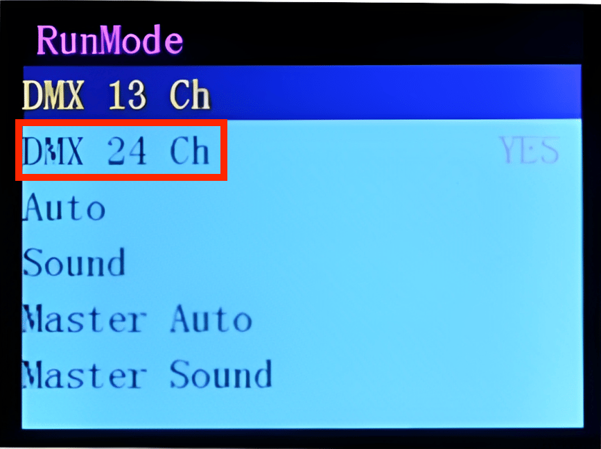 * Verifiquen en su equipo que el Menú "RunMode" muestre los modos dmx de 13CH y 24CH (ambos).