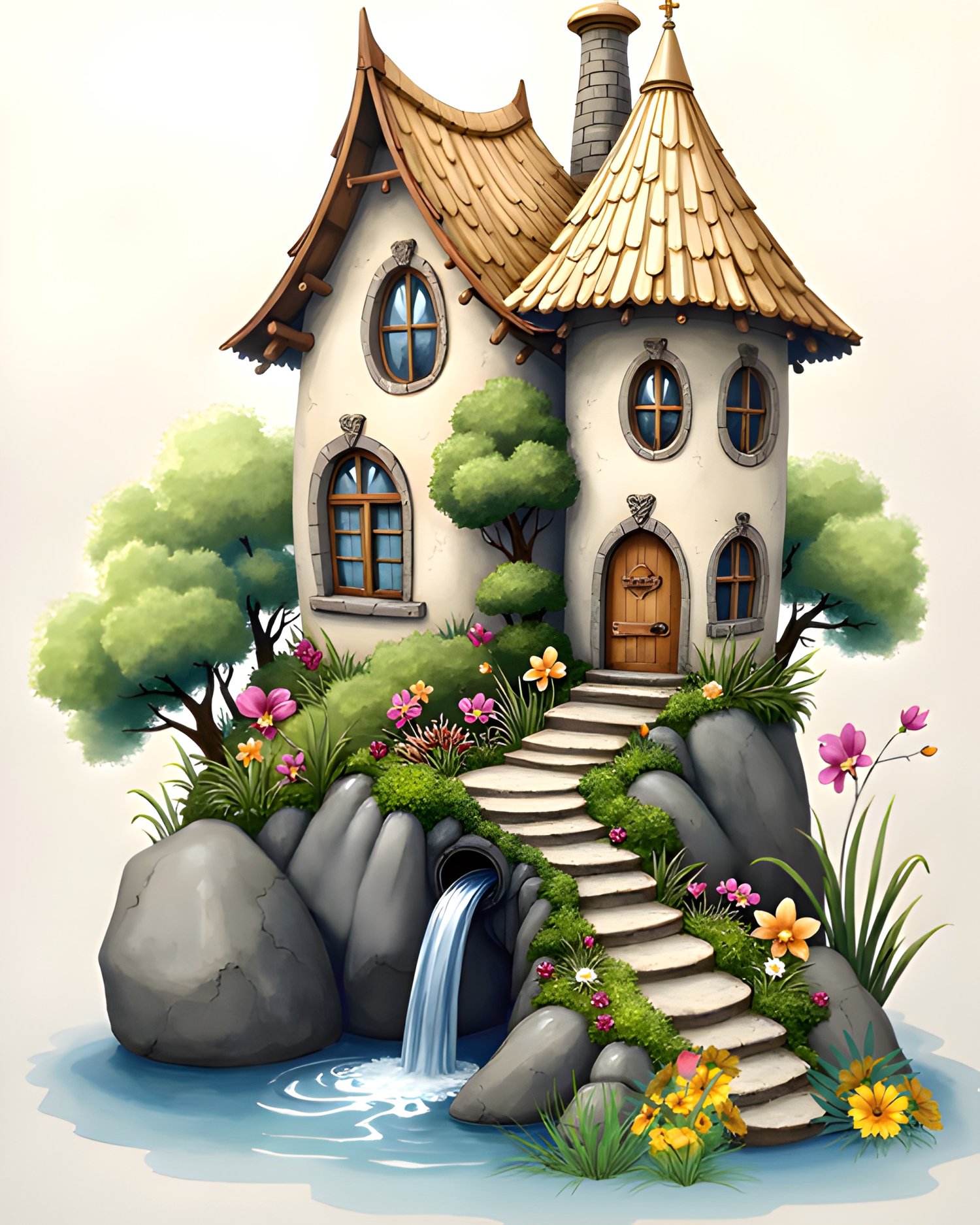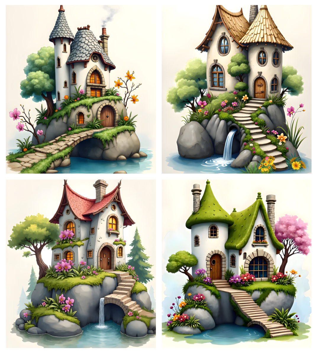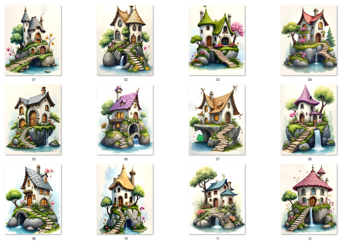 12 AI-generated JPG digital art prints – Fairy Stone Cottages – 12 Whimsical Waterfall Houses Art Prints , digital download, kids wall art. High resolution 300 DPI, 8:10 format, 2400x3000 pixels, ready for print or digital use. Instant download, no physical product. Commercial license included.