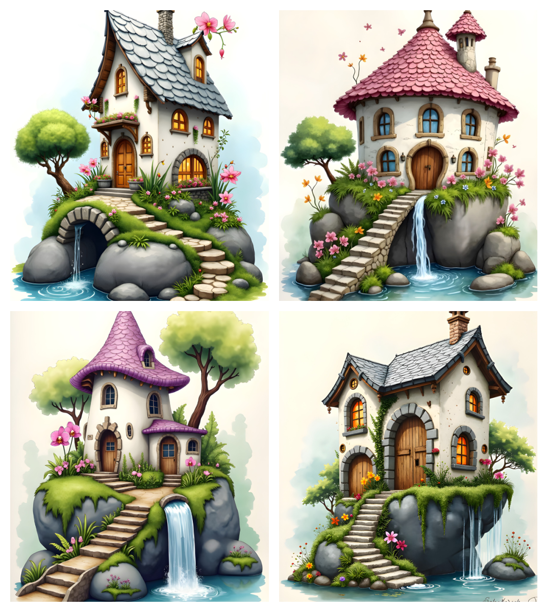 What You Get: Fairy Stone Cottages – 12 Whimsical Waterfall Houses Art Prints