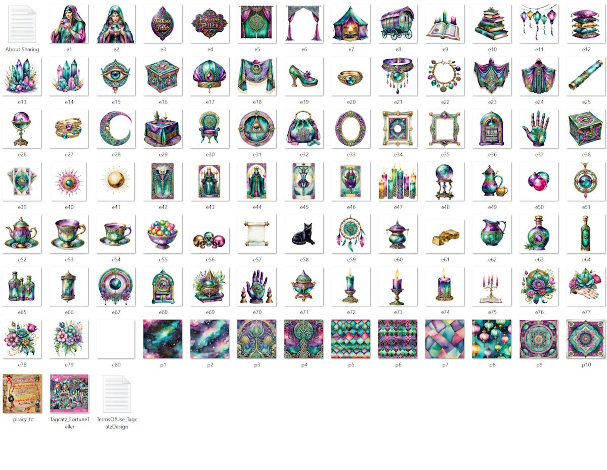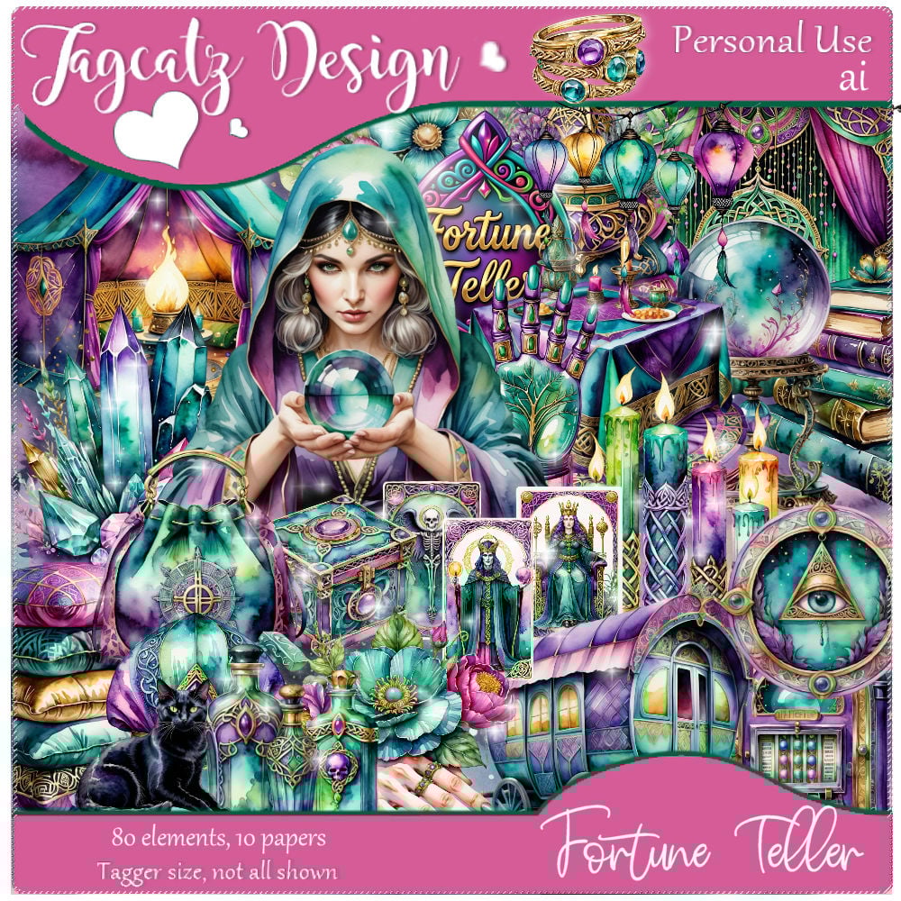 She sees your future in the cards! Fortune Teller has 80 elements and 10 matching papers. AI Generated. Tagger size. Not all shown. Personal use only.