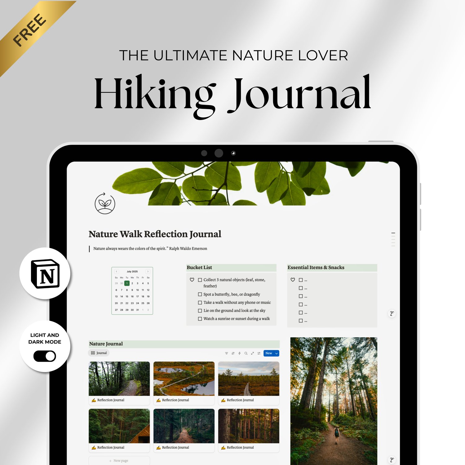 Keywords: nature walk journal, hiking planner, outdoor reflection journal, hiking checklist, nature journaling, trail planner, mindful hiking, Notion template, adventure tracker, forest walks, eco journal, bucket list planner, map organizer, hiking gear list, nature lover gift, digital hiking journal