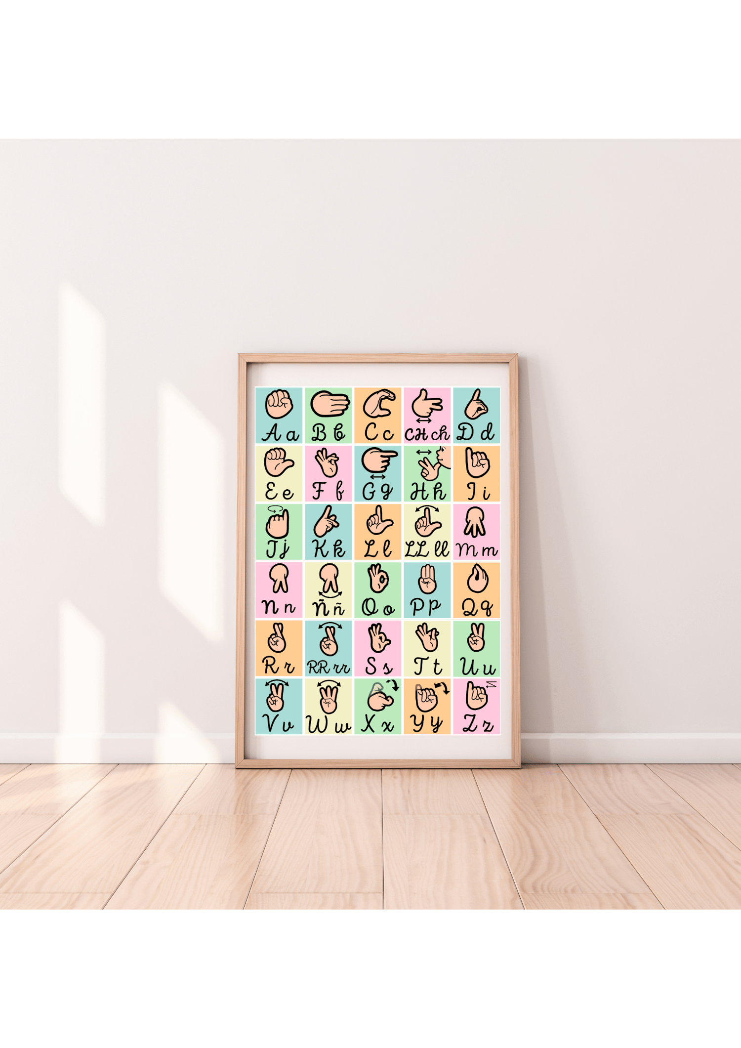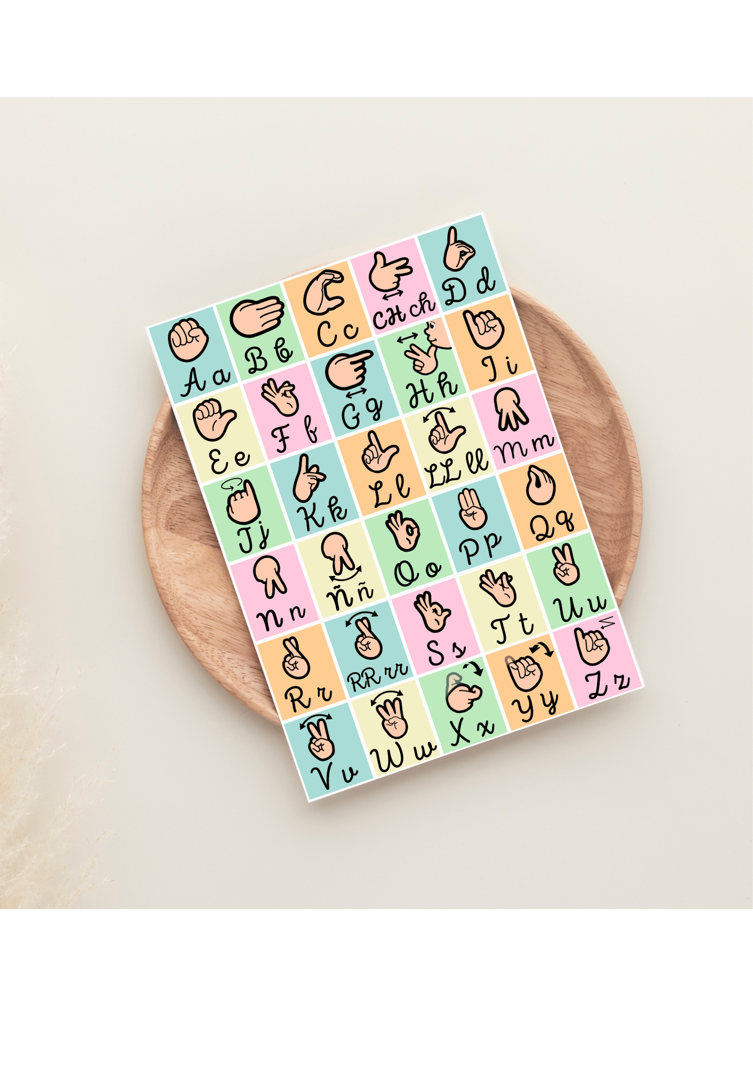 Transforma cualquier espacio en un rincón inclusivo y lleno de aprendizaje con nuestra lámina imprimible del abecedario de lengua de signos española en suaves colores pastel.