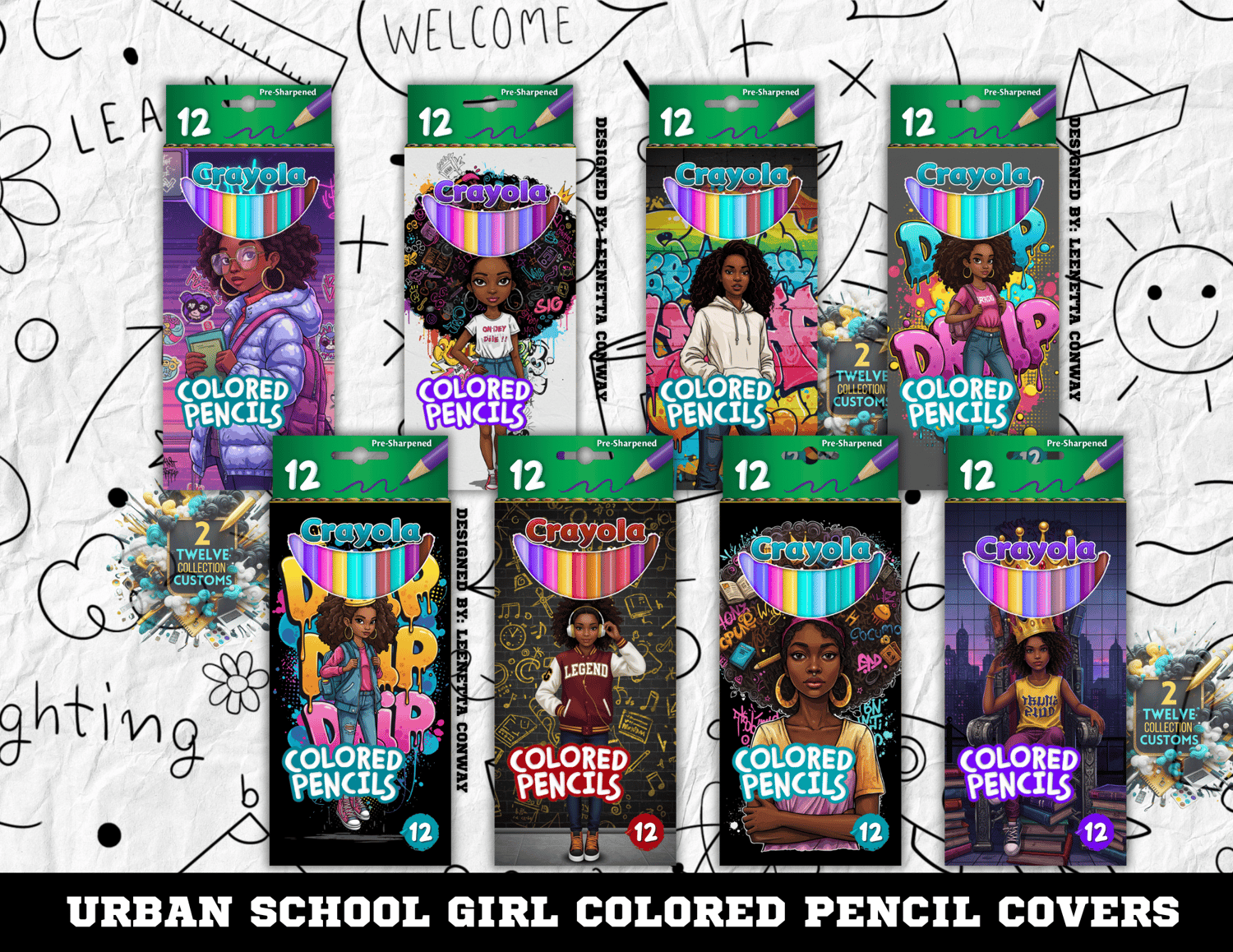 Urban School Girl 12Ct Colored Pencil Covers Canva Template 8 Pack | Digital Download