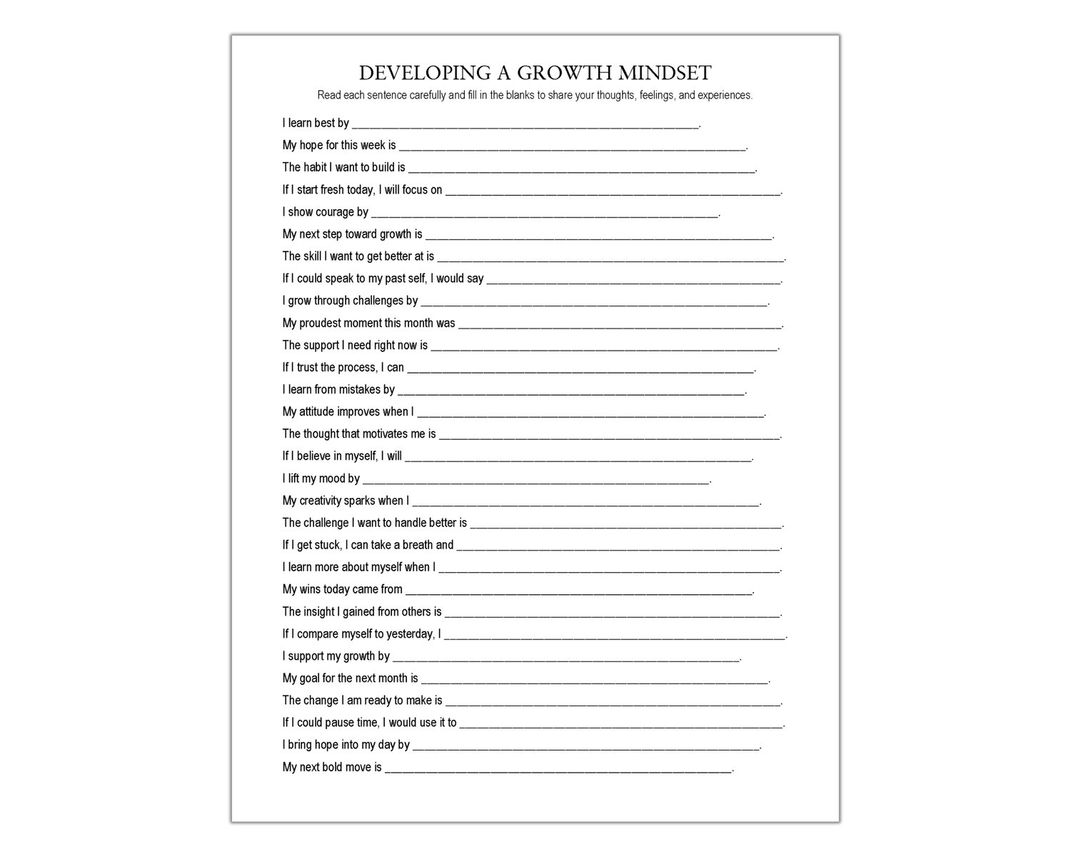 Progress, not perfection, is the goal. This Developing a Growth Mindset worksheet features 30 prompts to guide you to reframe negative thoughts into constructive ones that move you forward. Use it for therapy sessions, journaling, or self-reflection to practice shifting from a fixed to a growth mindset. Believe in your power to change!