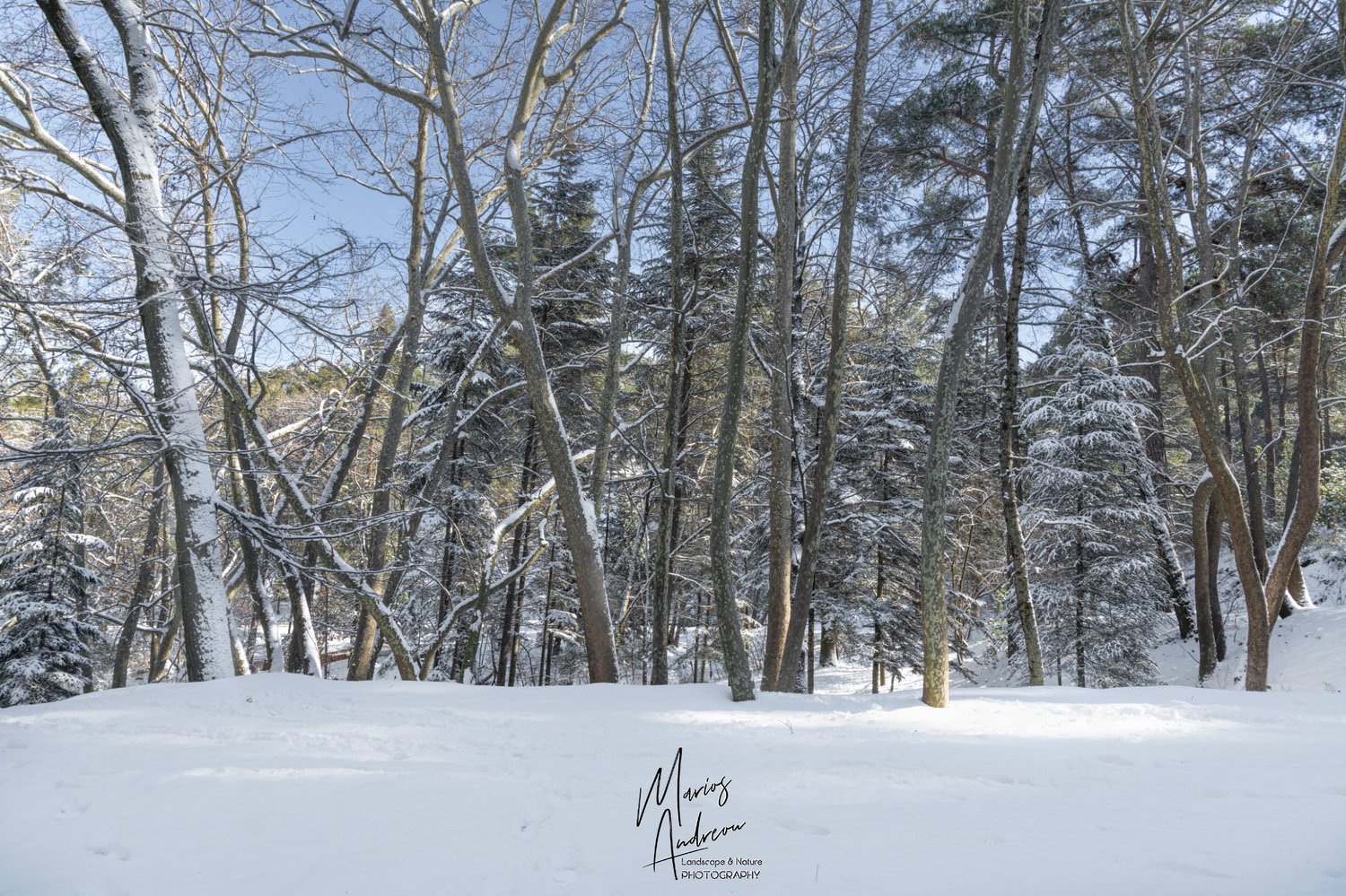 This photograph, titled 'Winter Colours,' captures a moment of serene beauty in the Troodos Mountains. A blanket of snow transforms the familiar landscape into a quiet, almost monochrome world, where the dark trunks and green needles of the pine trees stand out against the brilliant white. The muted tones and soft light create a sense of profound stillness and peace, offering a beautiful window into the quiet majesty of a Cypriot winter.