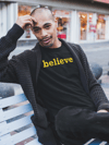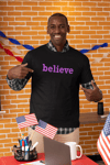 Unisex Believe black tshirt shirt, quality material, 100% cotton with various colored letters: yellow, purple, green. Sizes: XS, S, M, L, XL. Indicate color letters and size.