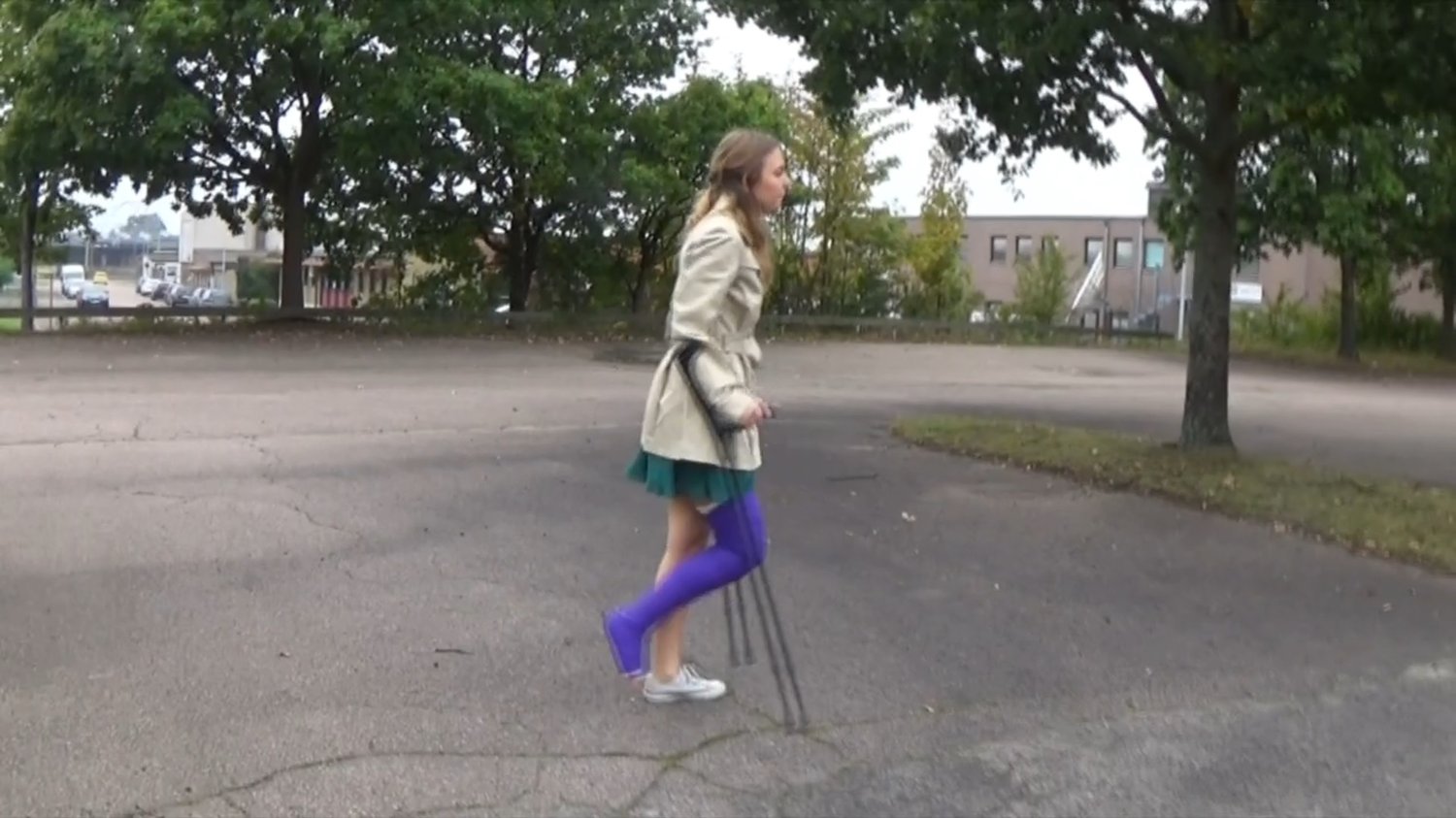 Tiiger is crutching from a parking lot and show us her LLC before she crutch down some steps on her way to the office.