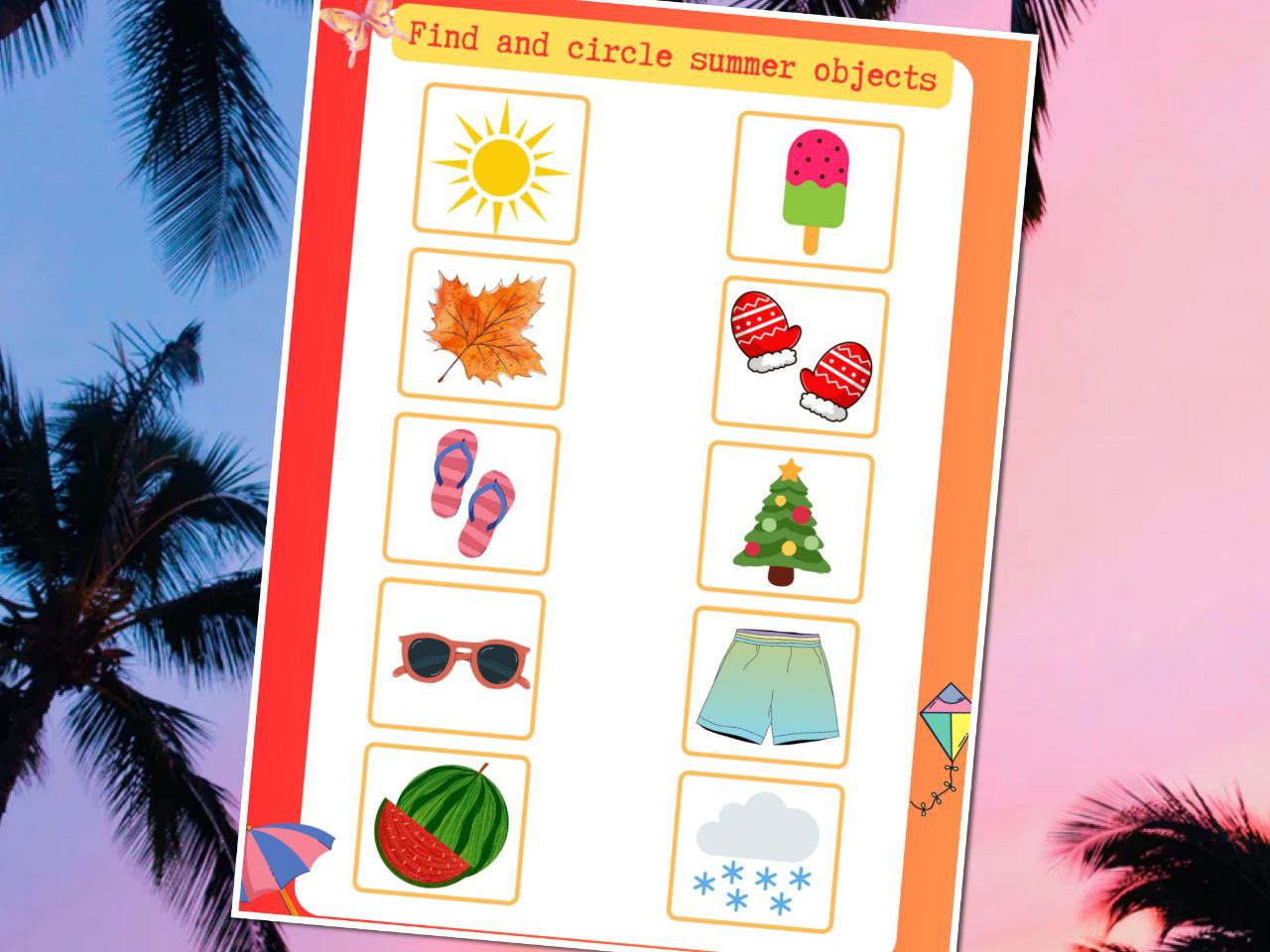 This simple and fun activity sheet helps children identify and circle objects related to summer. It’s a great way to develop attention, vocabulary, and visual discrimination skills. Kids will enjoy spotting suns, ice cream, flip-flops, and more!