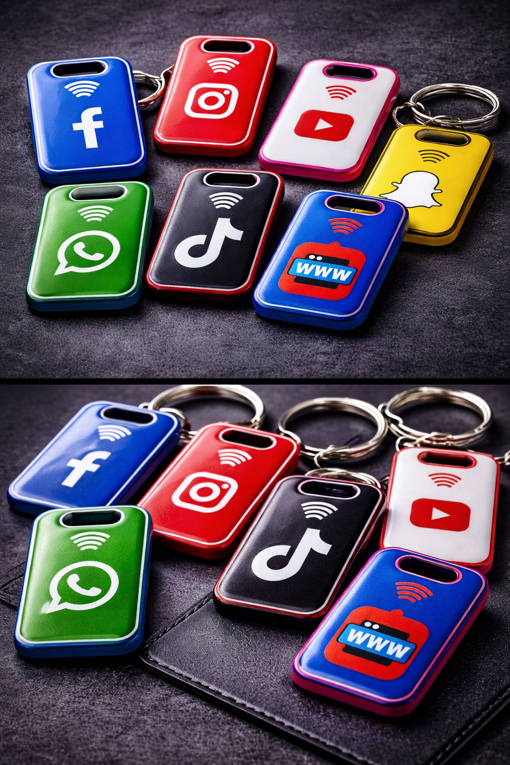 Dieser Premium NFC Schlüsselanhänger kombiniert modernes 3D-Design mit einer glänzenden Epoxy-Oberfläche für einen luxuriösen Look, der sofort auffällt.