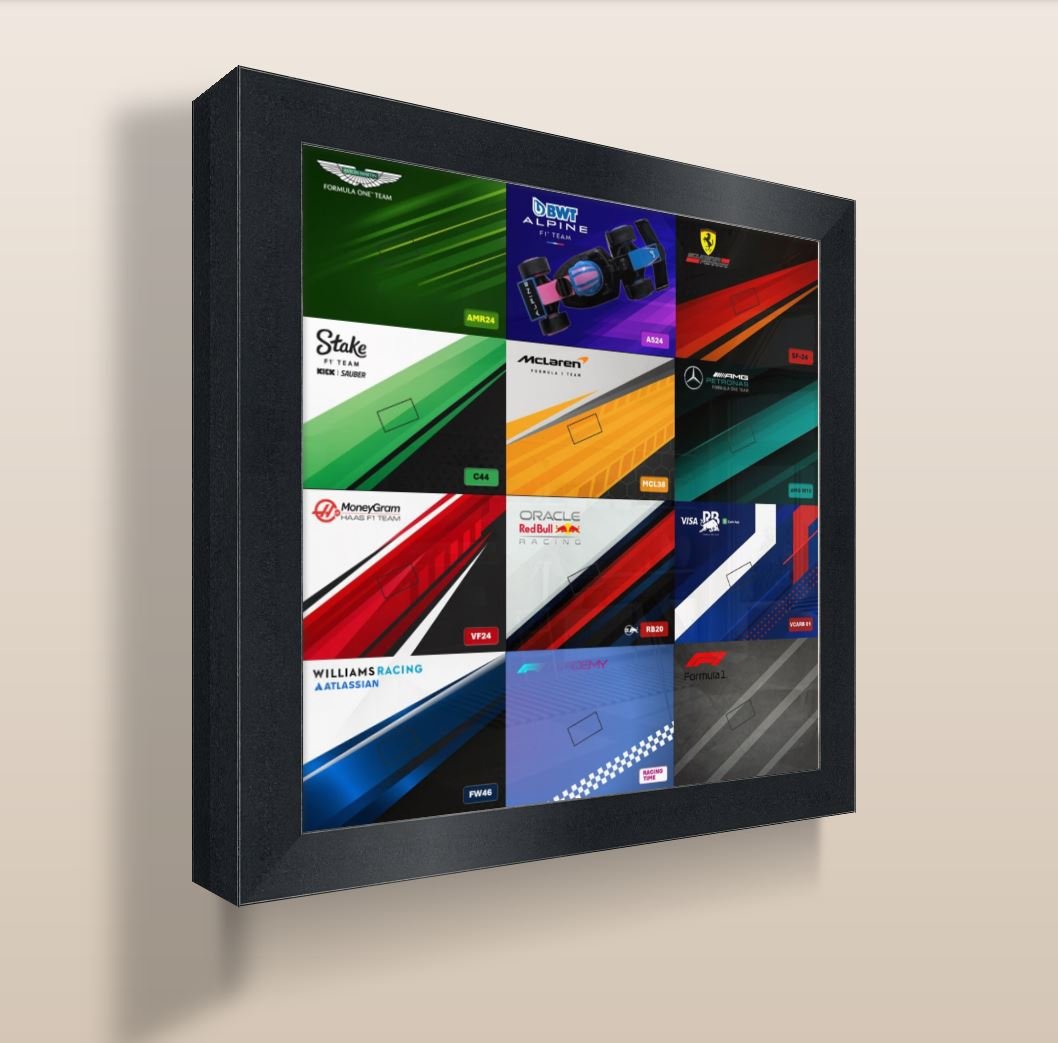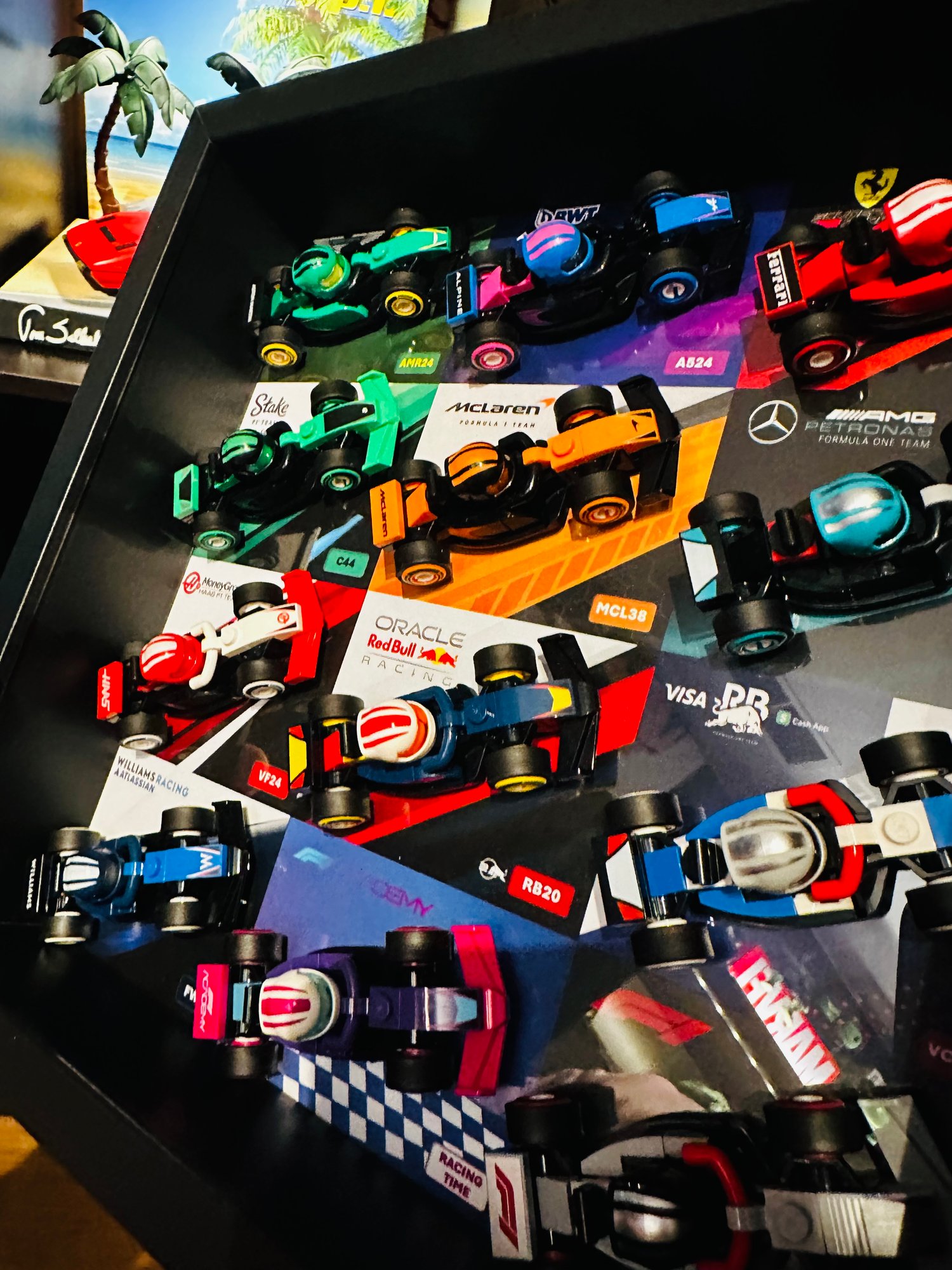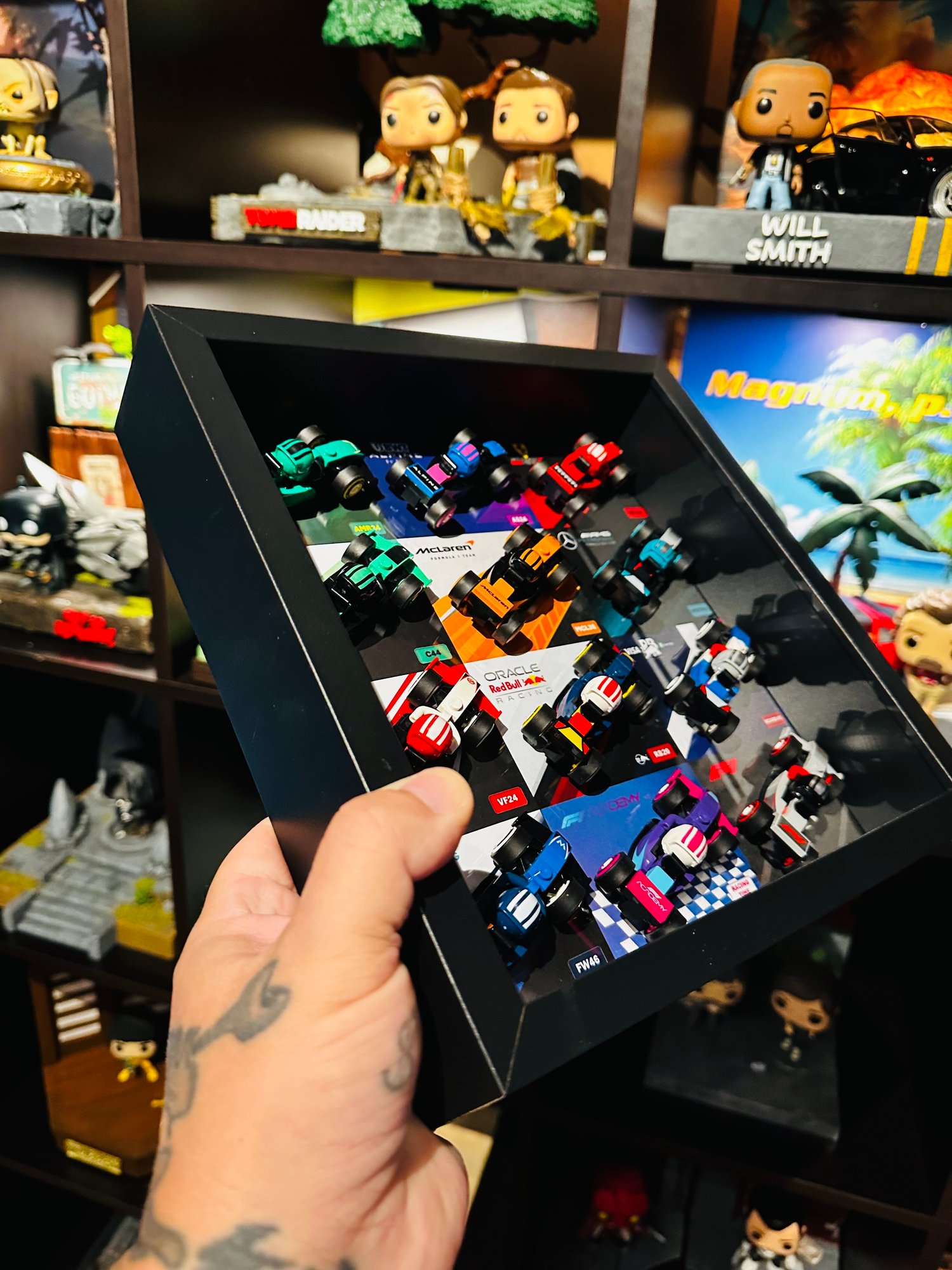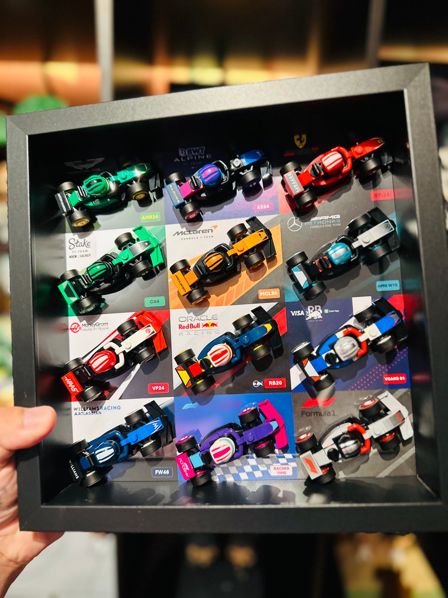 Ajoute une touche F1 unique à ta déco avec cette affiche carrée 25x25 cm (10x10 in), pensée pour exposer jusqu’à 12 mini voitures compatibles LEGO Formula 1.