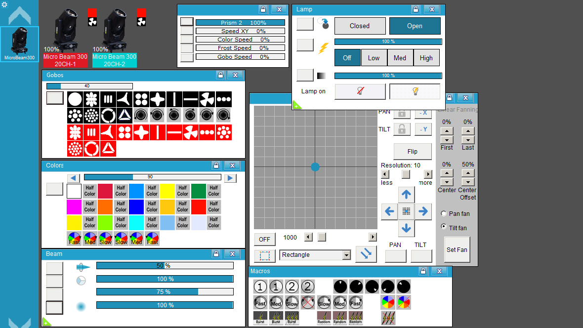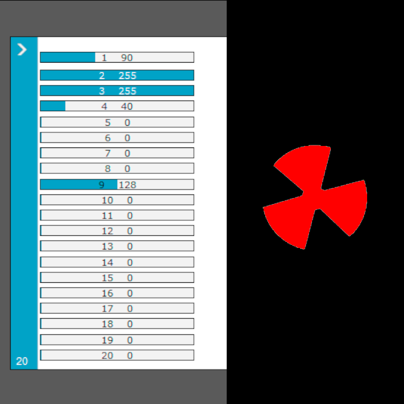 * Verifique, con el Fixture de pruebas de 20CH (click), que coincidan estos canales: 3 Dimmer, 2 Strobo / Shutter, 1 en el valor 90 = Color Rojo, 4 en el valor 40 = Gobo de Ventilador tres aspas, 9 foco (ver tercer foto).